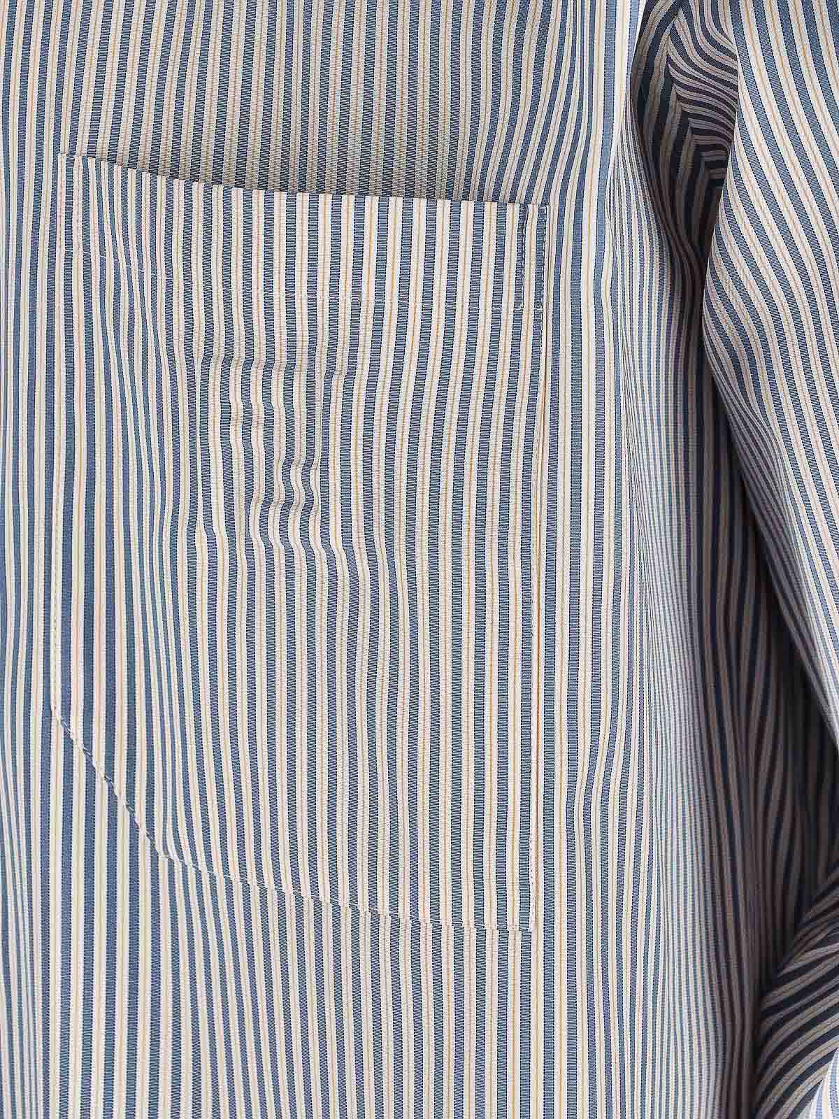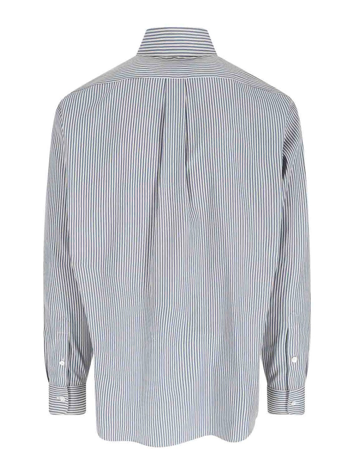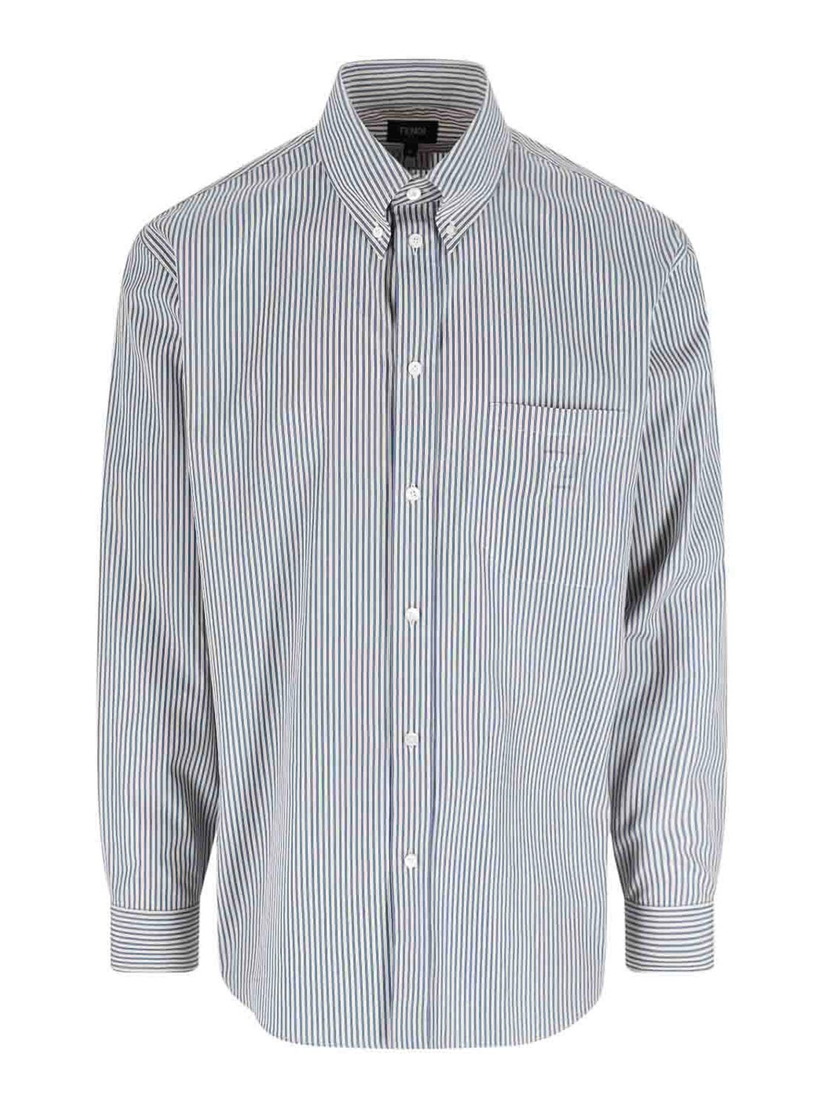 Fendi button-down shirt, in light blue cotton, striped pattern, collar, button closure, long sleeves, one front pocket, ff logo detail embossed on the front, buttons on the cuffs, darts on the back, curved hem.