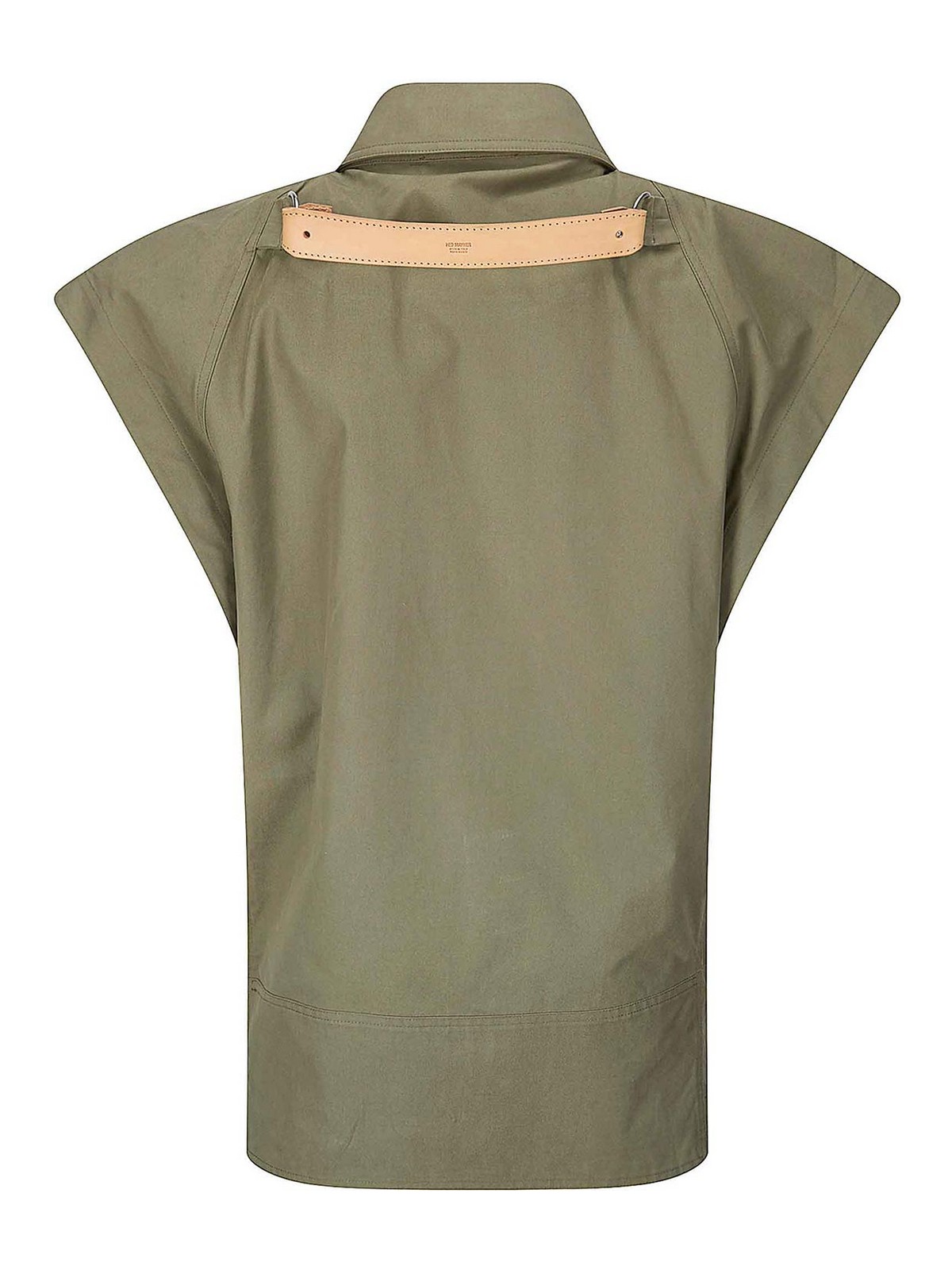 Oversized green pea jacket with super wide sleeves, leather detail on the back, side pockets with flap, belt on the bottom.