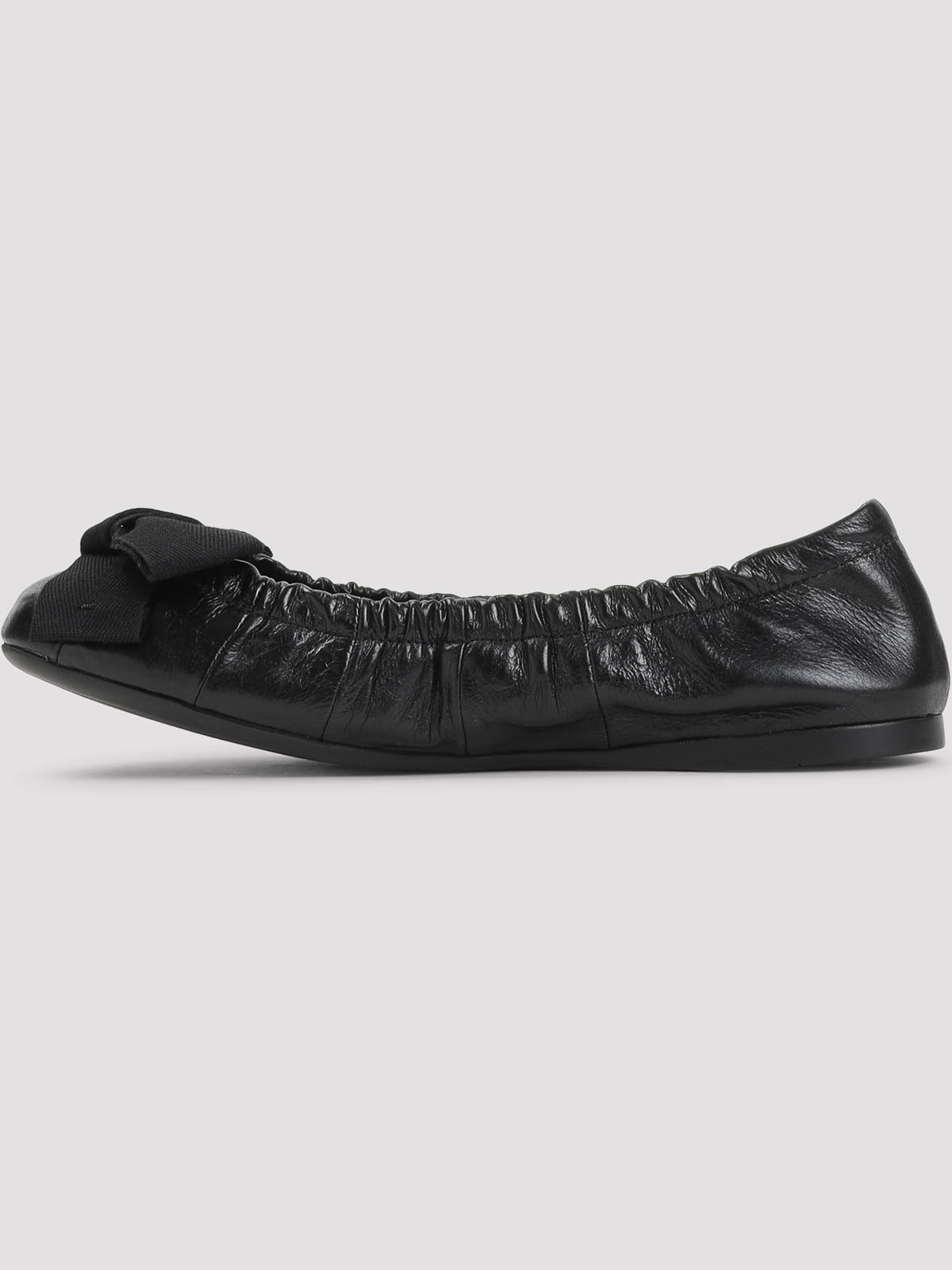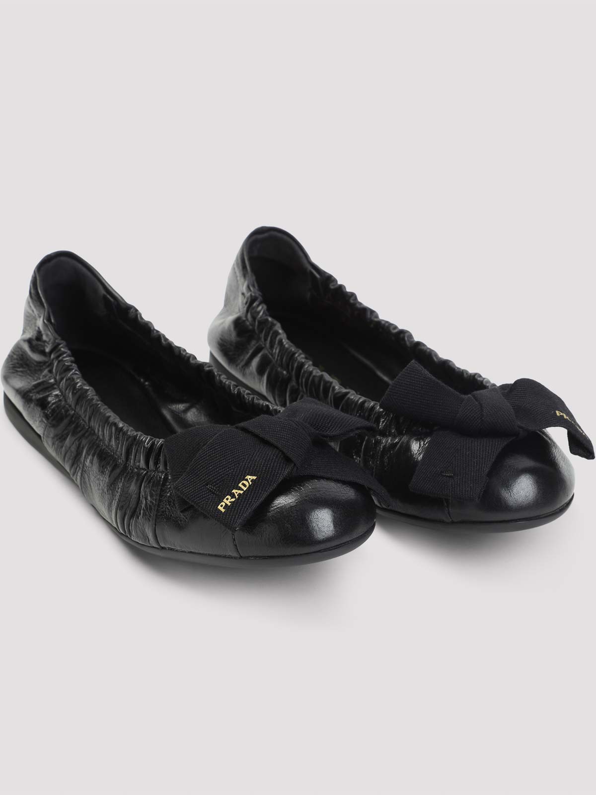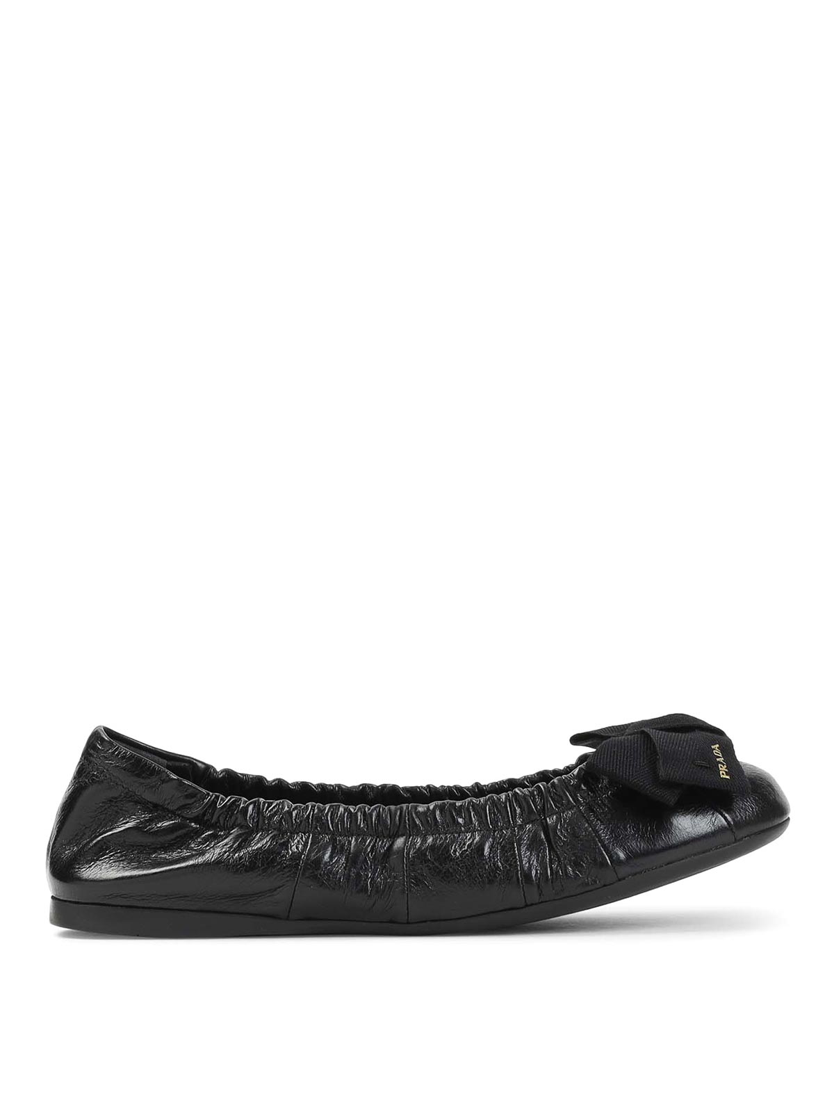 Prada black calf leather ballerinas. crafted from brushed black calf leather, featuring a gathered construction, a round toe, a grosgrain bow with stamped logo detail, a leather insole, and a flat rubber outsole.