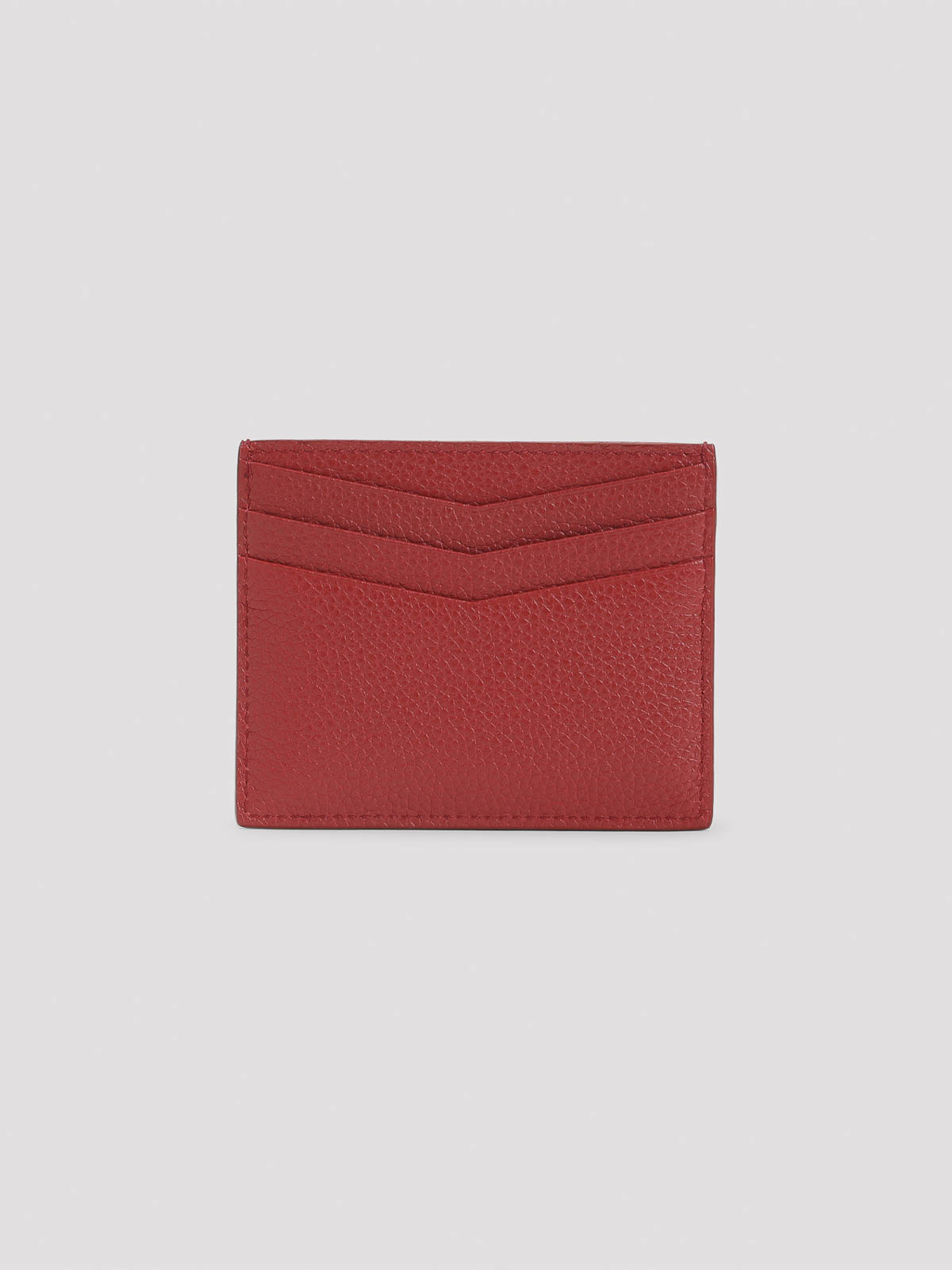 Miu miu red calf leather card case. crafted from red grained leather, featuring a gold-toned metal lettering logo on the front, three v-line card slots on the front and back, and one central top slot.