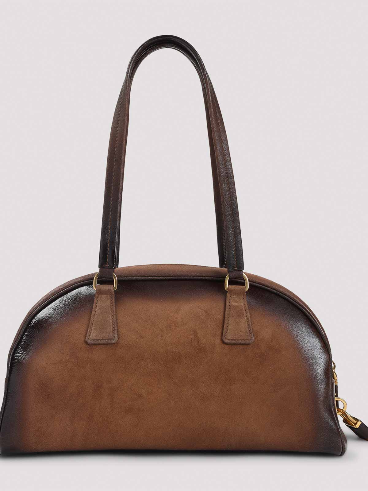 Prada brown calf leather handbag. crafted from aged brown calf leather, gold-toned hardware, top handles, stamped logo on the front, zip fastening, branded padlock, lined.
