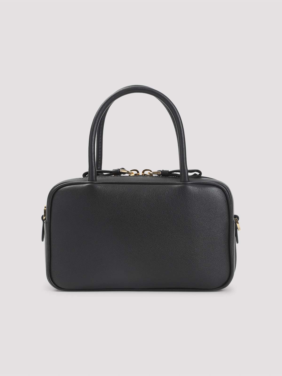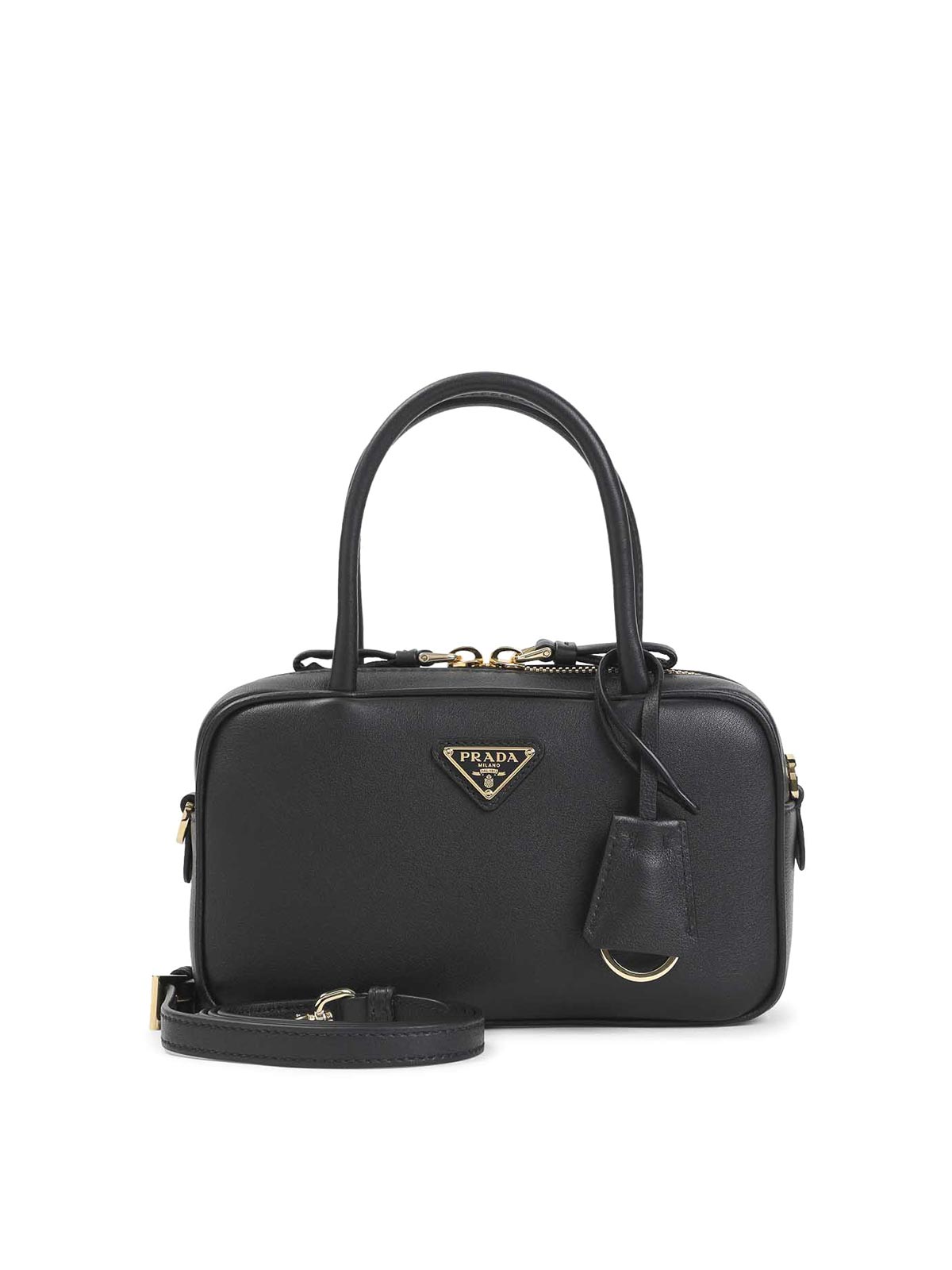Prada calf leather handbag. crafted from black calf leather, featuring gold-toned hardware, top handles, a front enameled triangle logo, a two-way zip fastening, a detachable branded keyring, and an attachable and adjustable shoulder strap.