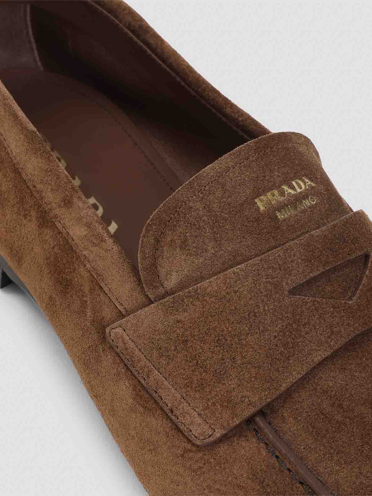 Prada brown calf leather loafers. crafted from brown suede leather, featuring a rounded square toe, a front piping detail, a penny strap on the top, a gold-toned stamped logo, a leather lining and insole, and a leather sole.