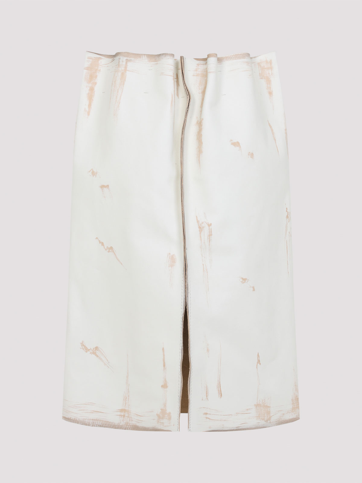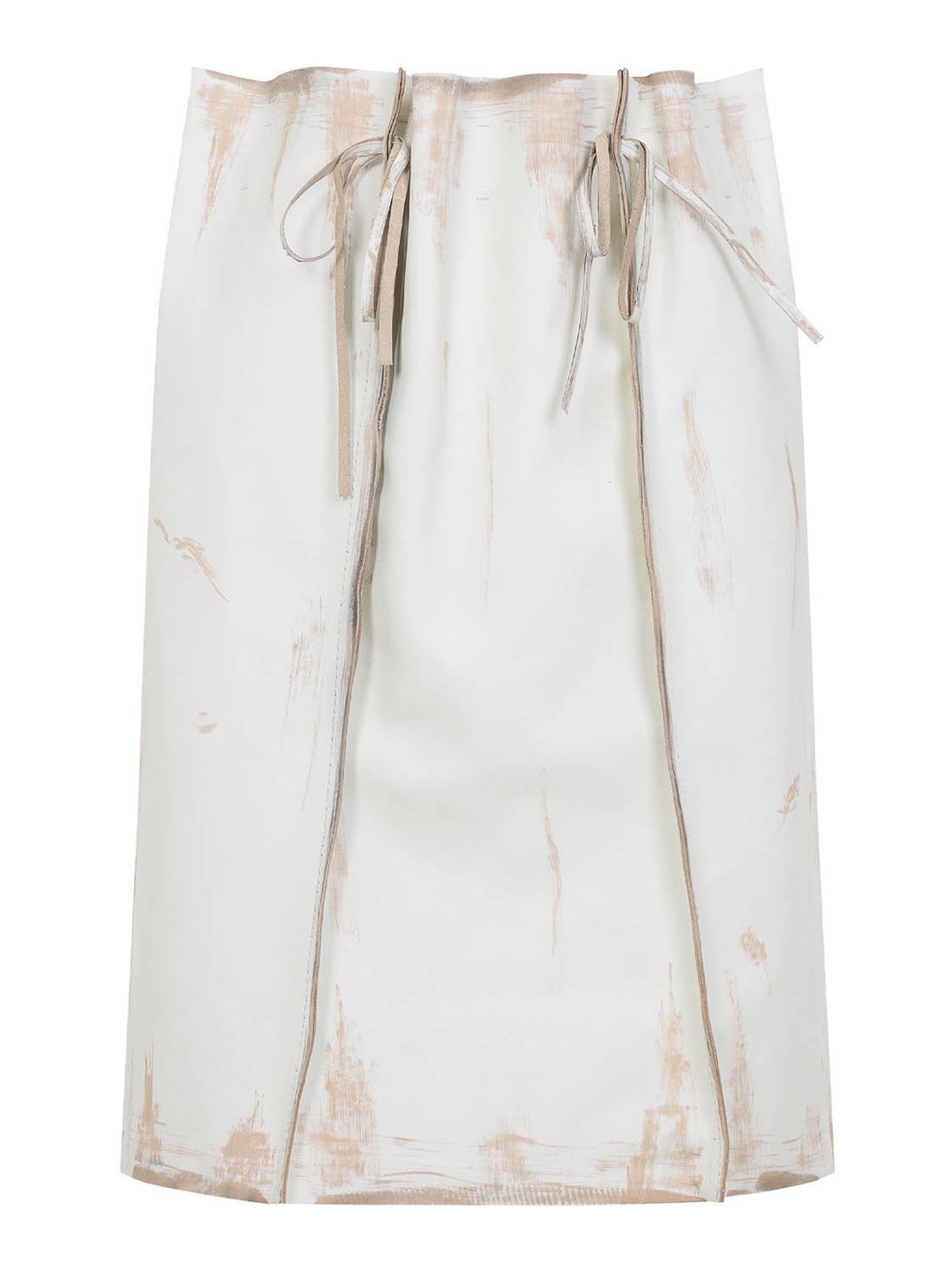 Prada white midi skirt crafted from white aged effect all over raw cut edges two bow hidden elastic central back slit unlined