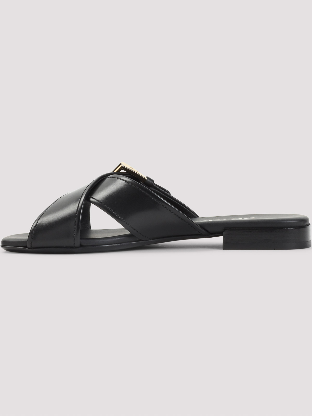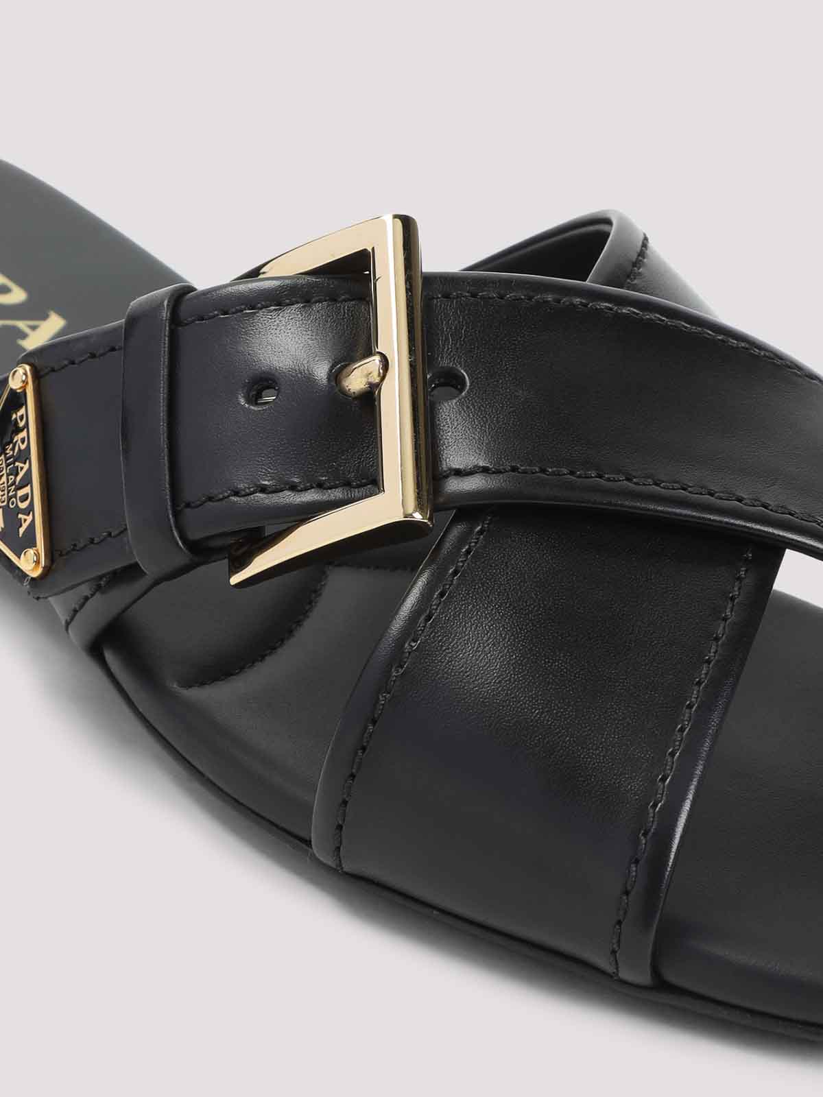 Prada black calf leather sandals. crafted from black calf leather, featuring a squared open toe, two crossed straps with a gold-toned buckle, an enameled triangle logo detail, a leather insole and outsole, and a flat block heel.
