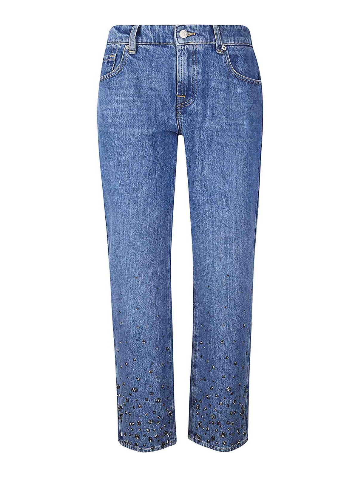 Low waist jeans, five pockets, button and zip closure, straight leg with studs and jewel stones.