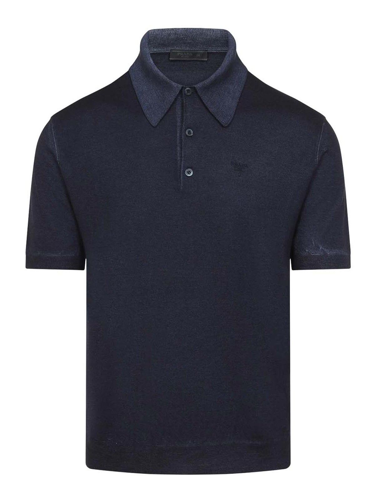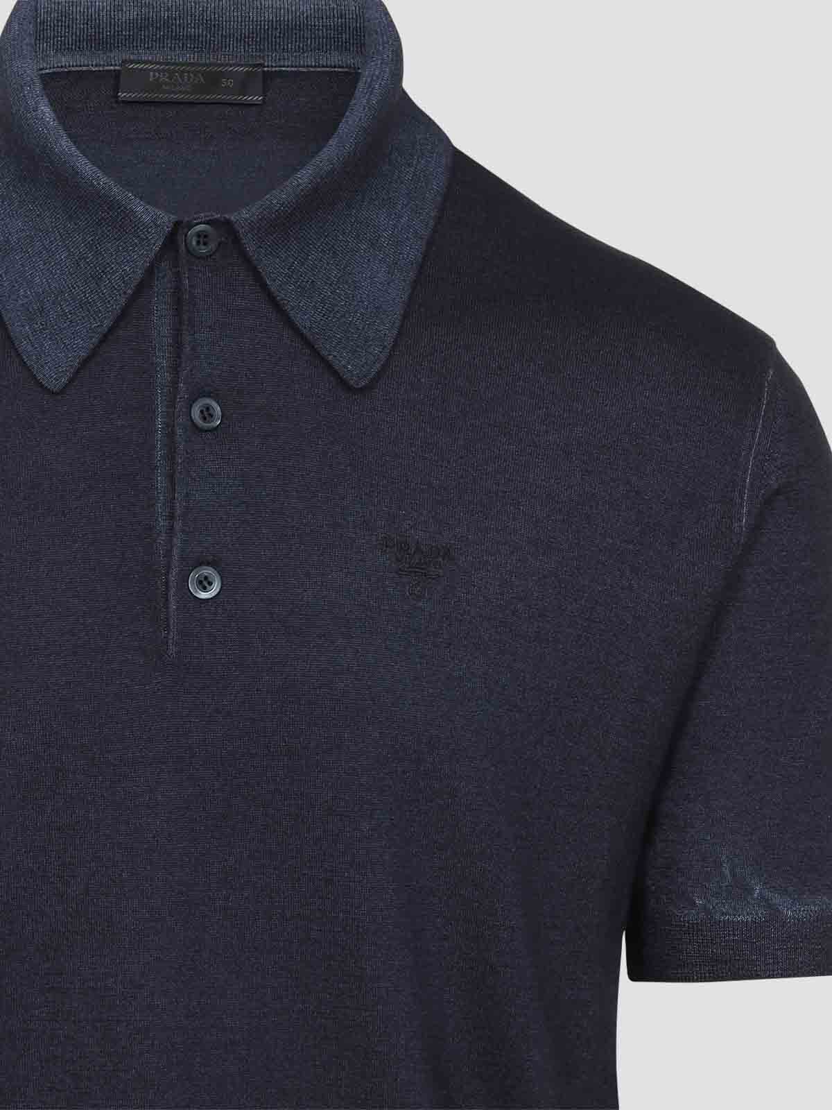 Prada blue cashmere polo. crafted from blue cashmere yarn, washed effect, shirt collar, front button fastening, embroidered logo on the chest, short sleeves, ribbed collar and cuffs, straight hem.