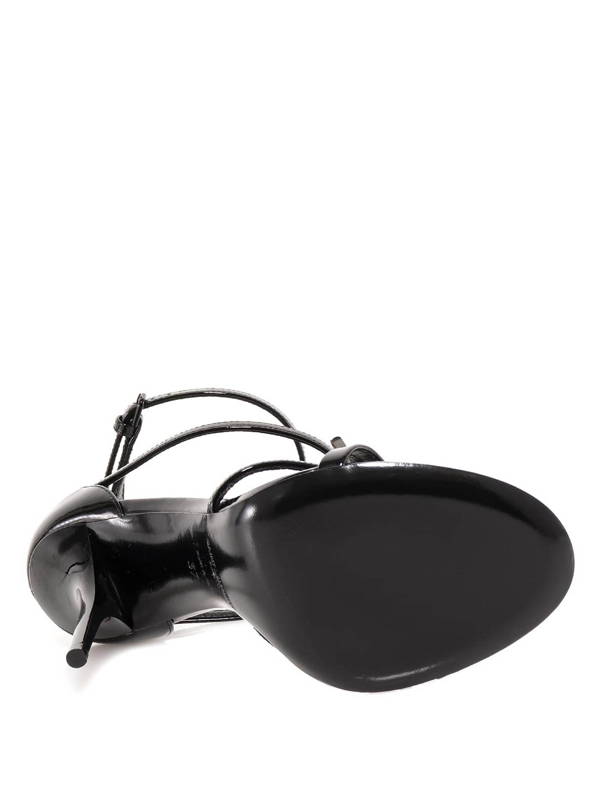 Patent leather sandals detailed with covered stiletto heel, adjustable ankle strap and front metallic YSL monogram.