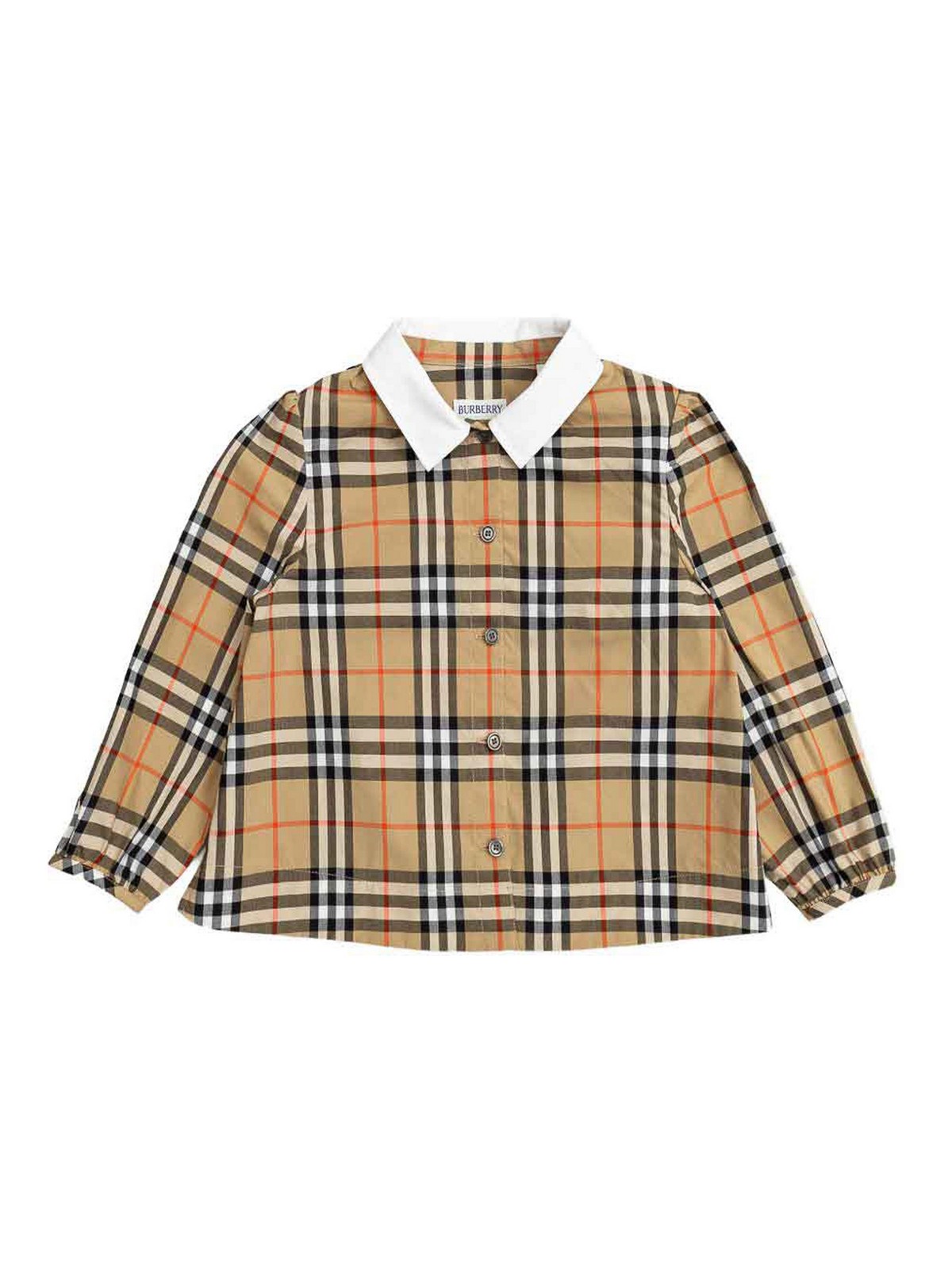 Features sand check pattern pointed collar button closure long sleeves buttoned hems 100% cotton composition.