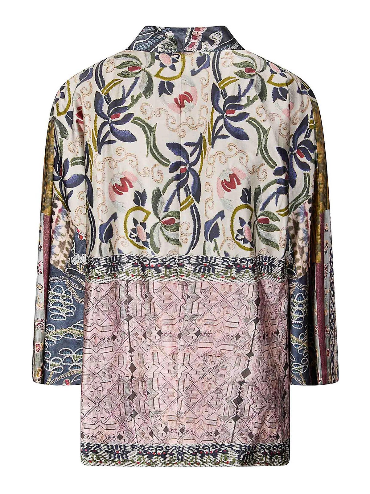 Kimono-style shirt with contrasting print and details, light fabric, slightly flared sleeves.