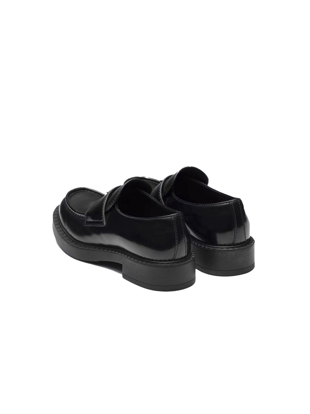 The classic masculine loafer is redesigned with new volumes and sophisticated an iconic material of the brand the shoe is decorated with the triangle logo stitched edges and a special pattern on the black elastic gusset on the instep band enameled triangle logo on the vamp light lug with para, style half, mm