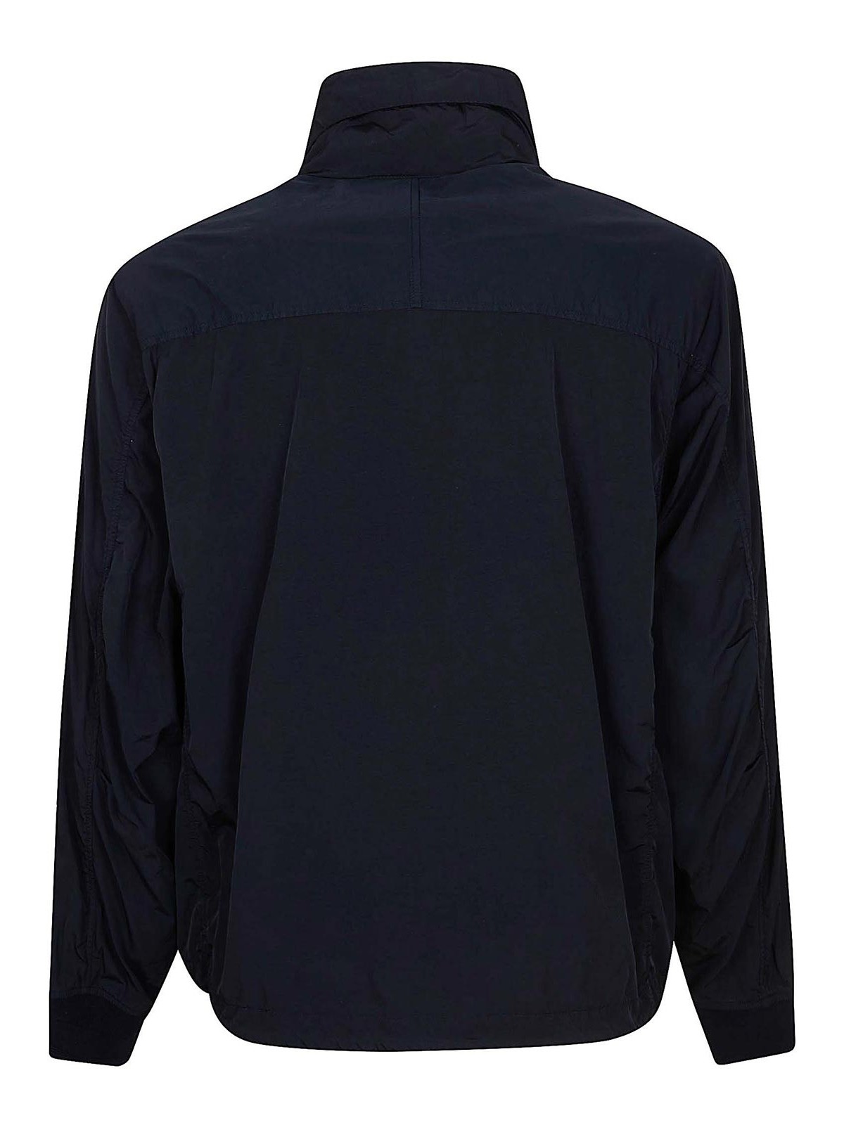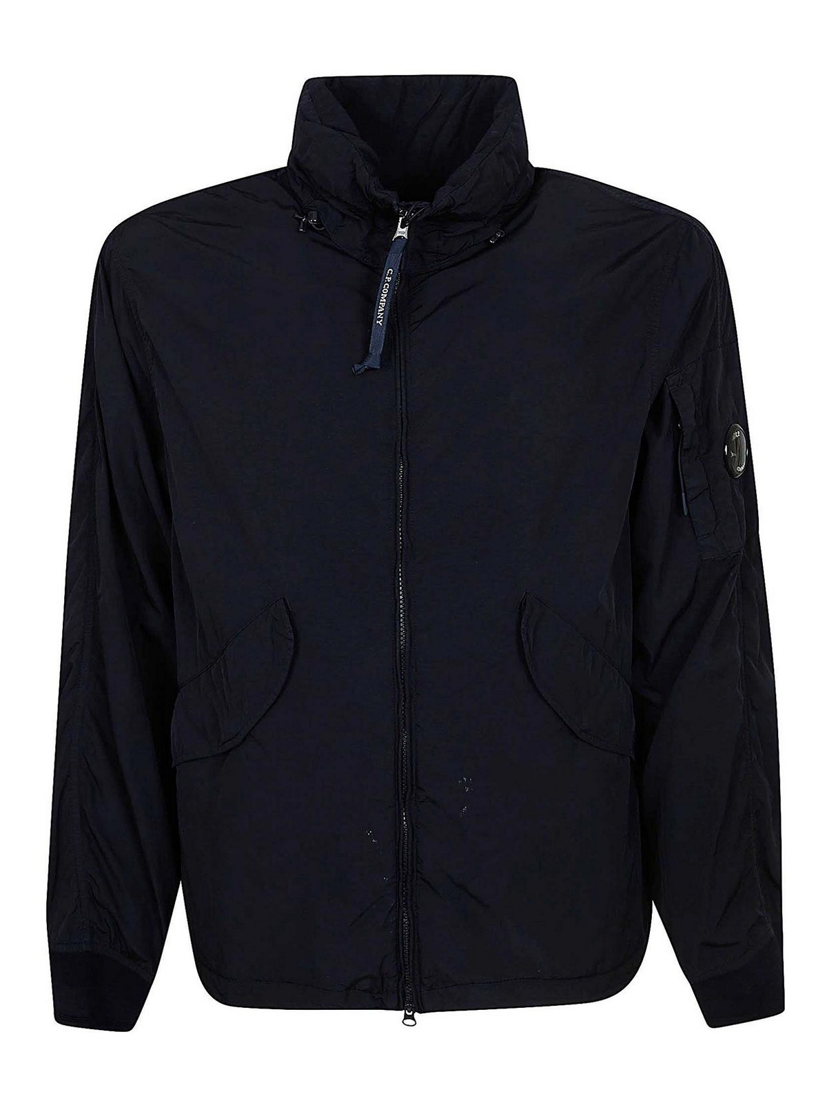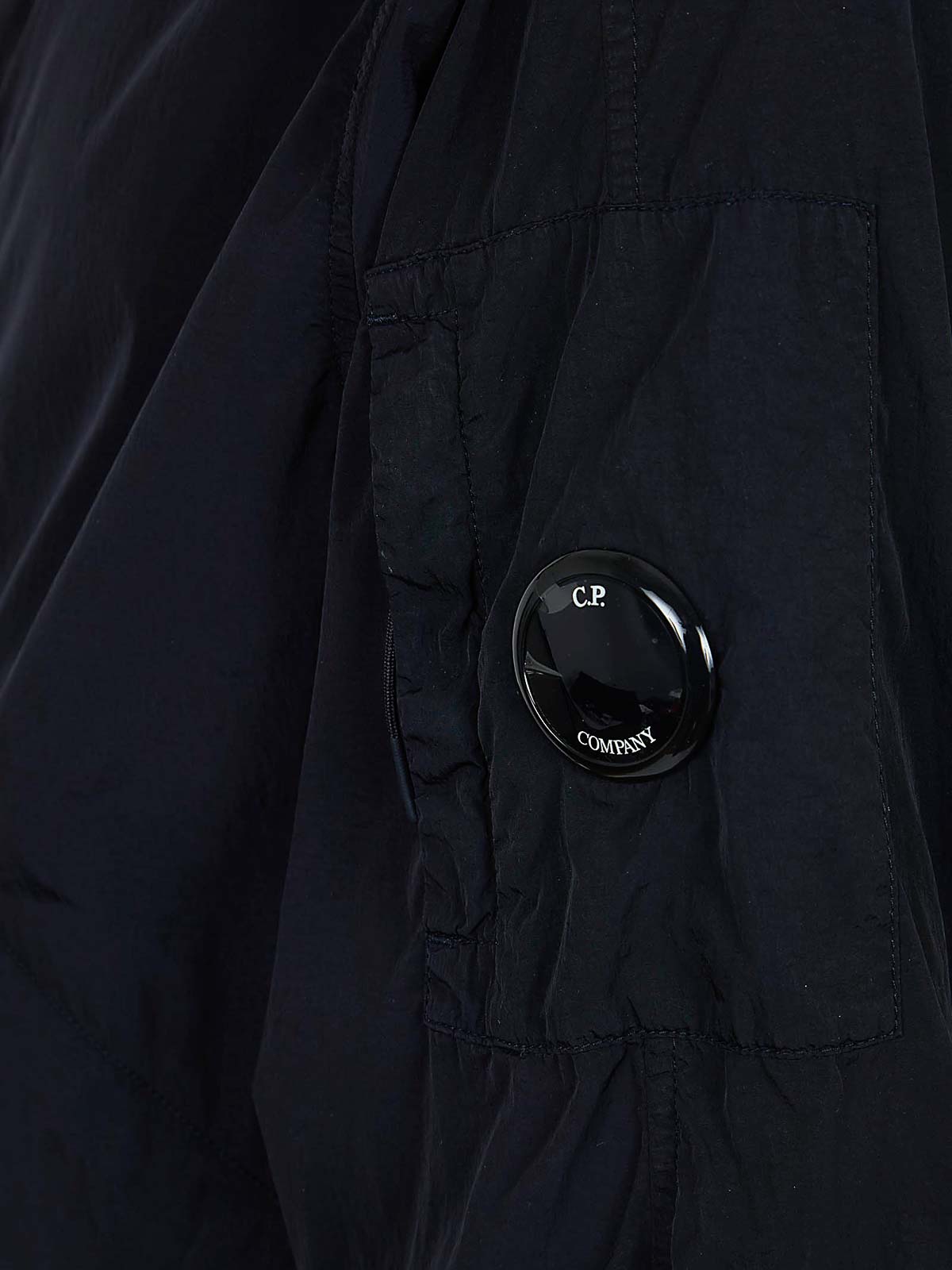 Jacket made of chrome, a shiny multifilament by CP company, full double-slider zip, side pockets with flap and snap buttons, elasticated cuffs, adjustable hem with drawstring, regular fit design, adjustable, concealed hood with zip opening characterized by a small pocket with the iconic CP company lens on the