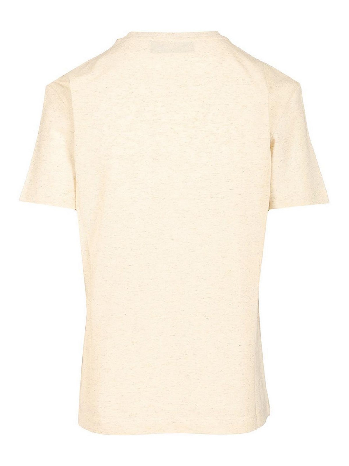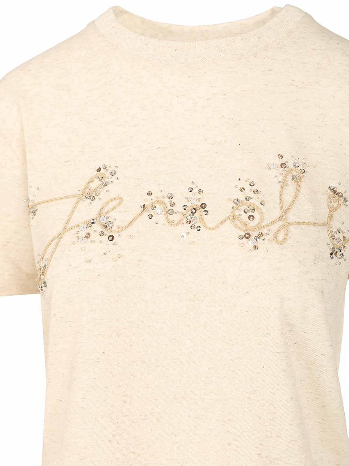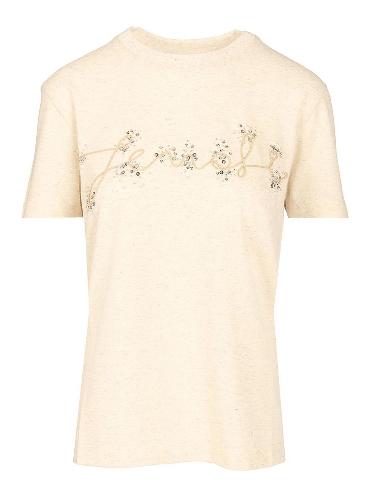 Cotton and linen t-shirt by fendi, with crew neck and short sleeves, personalized with sequins and cornely embroidery reproducing the fendi logo on the front.