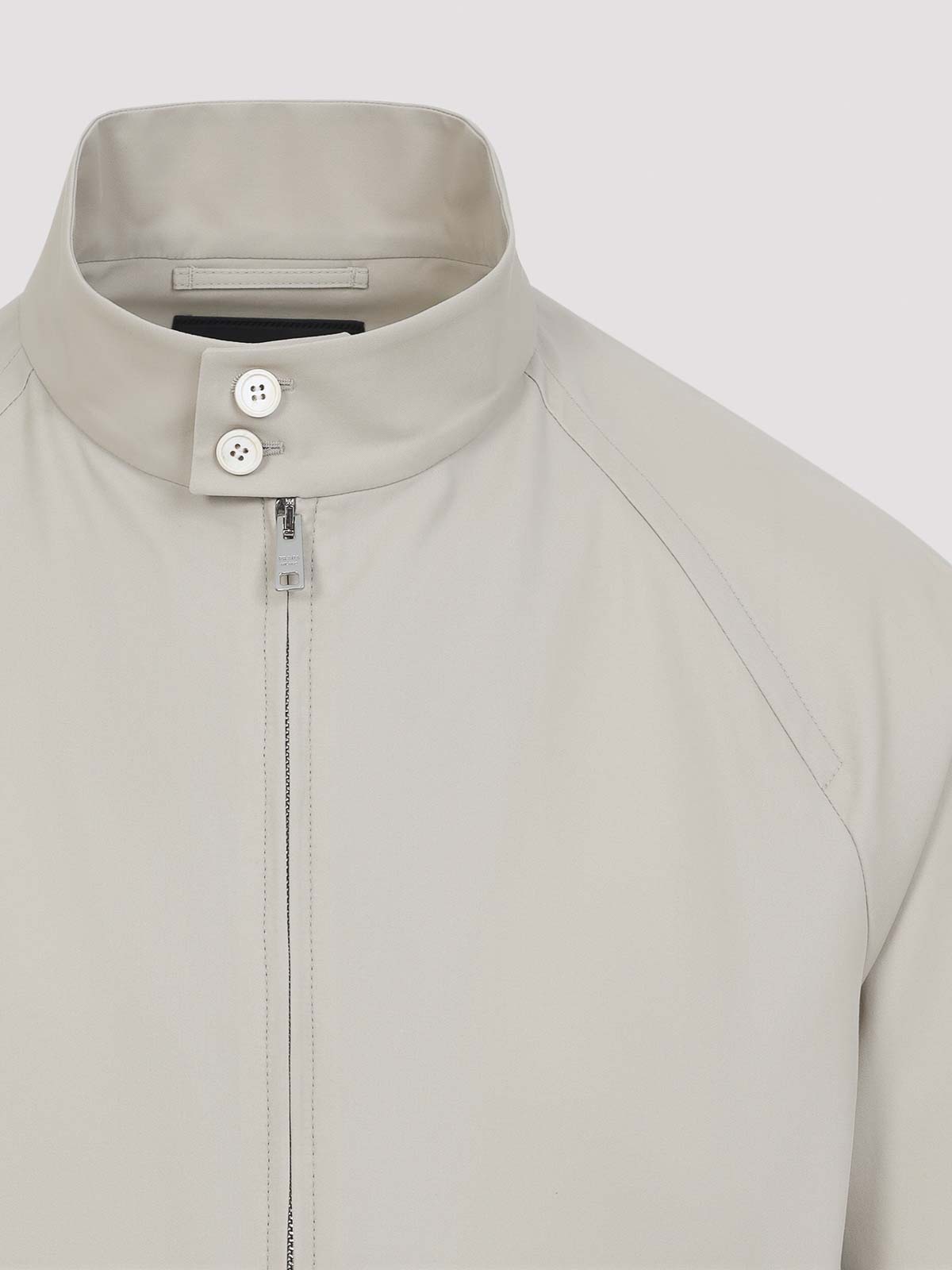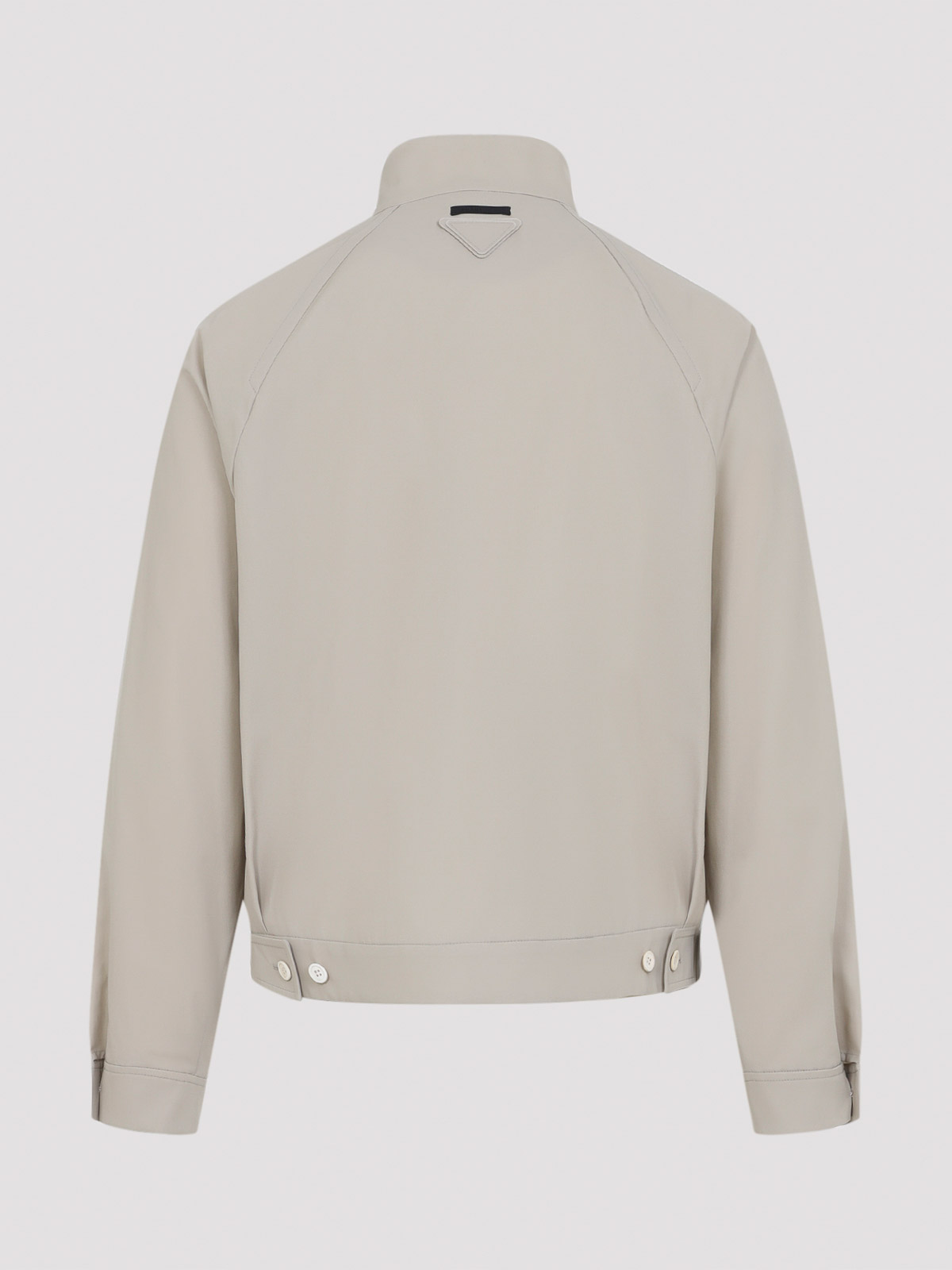 Prada beige cotton jacket. crafted from beige cotton, featuring a round neckline with snap buttons, a front zip fastening, two front welt pockets, long raglan sleeves with buttoned cuffs, a branded label and a tonal triangle logo at the back of the collar, adjustable straps at the hem, and a straight hem.