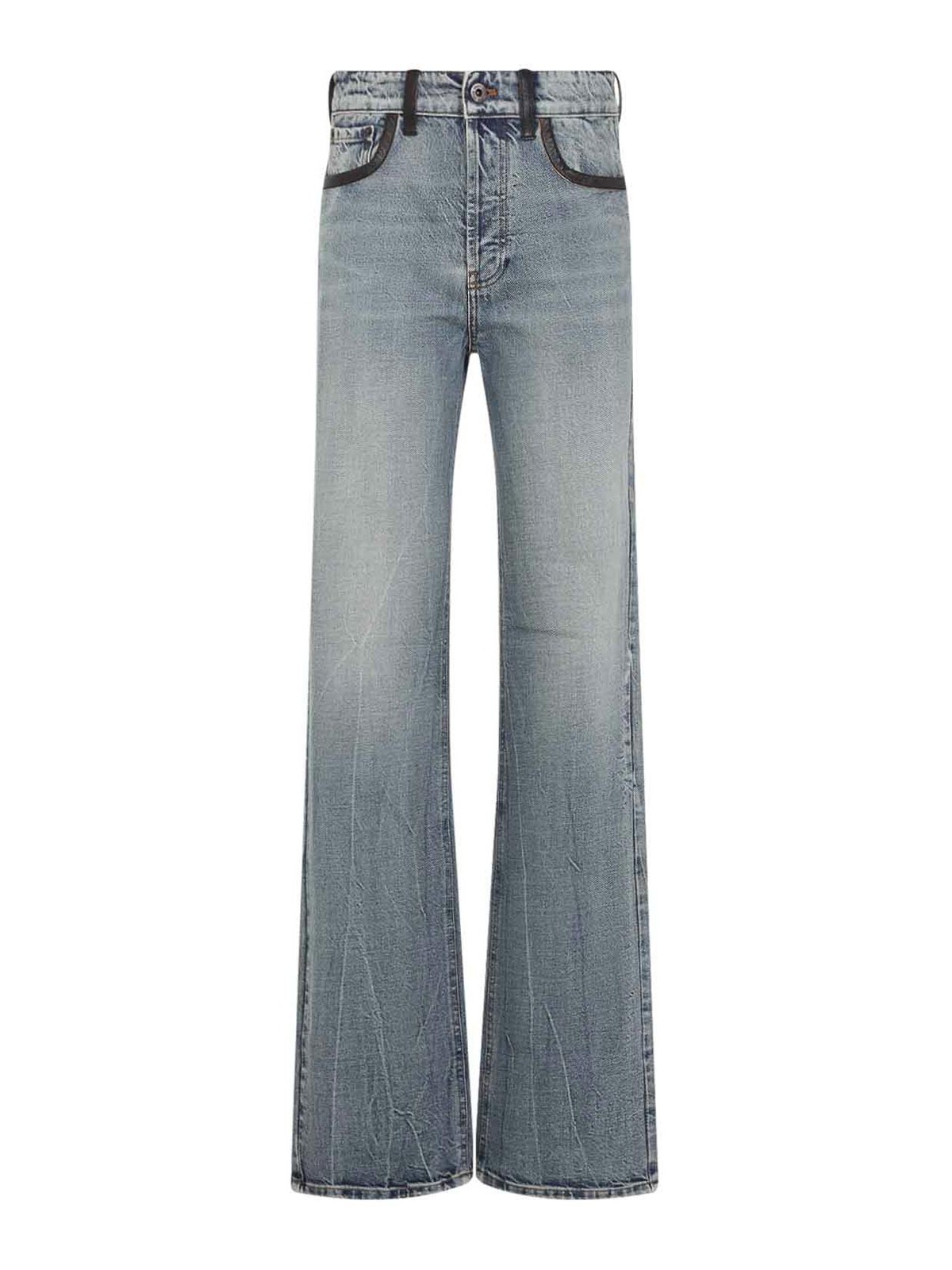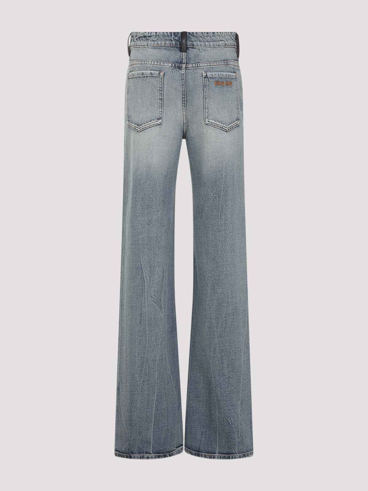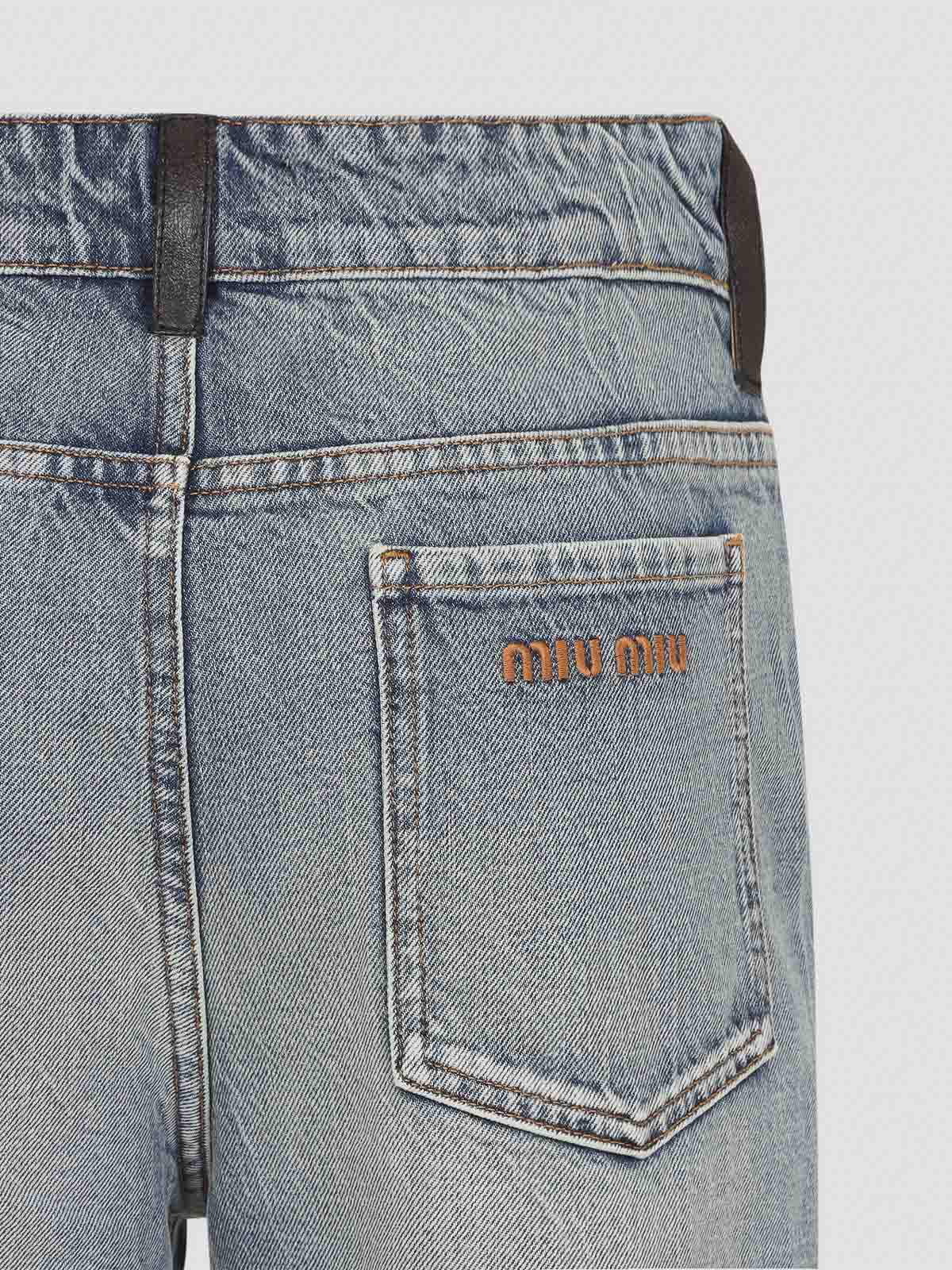 Miu miu light blue cotton jeans. bleached light blue cotton denim, leather belt loops and front details, 5-pocket design, button and fly-zip fastening, embroidered logo at the back pocket, straight leg.