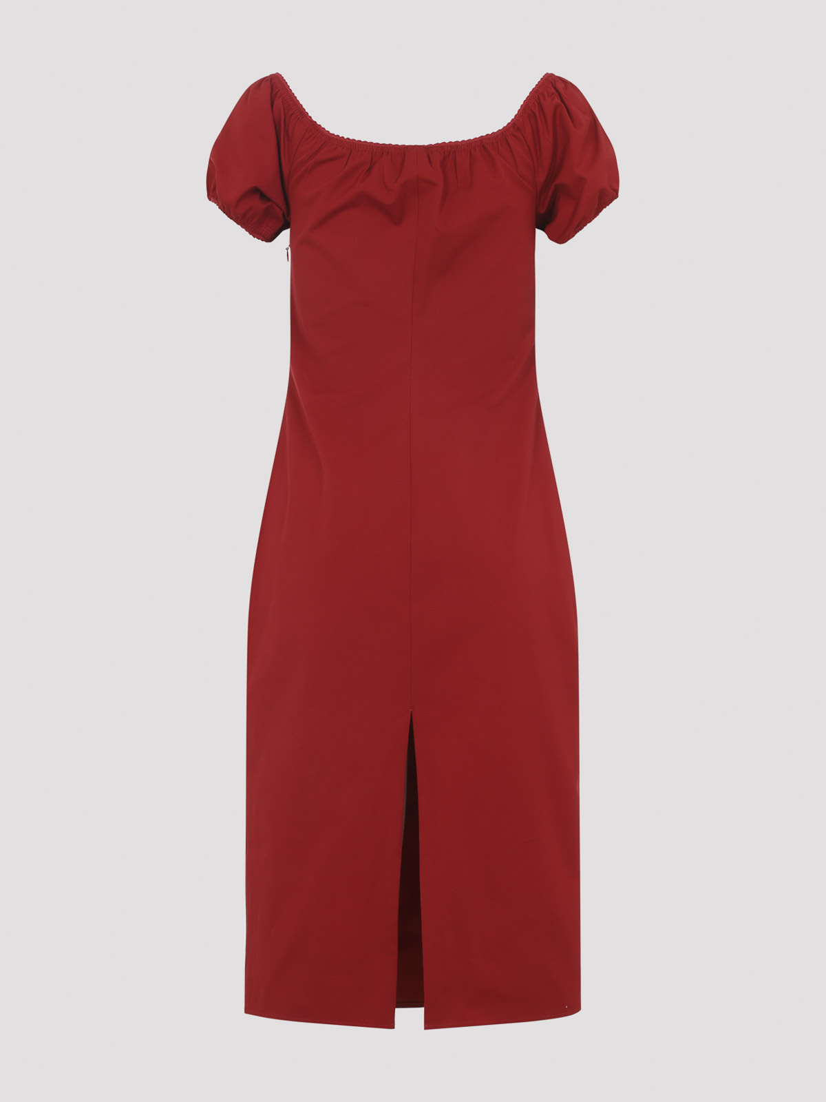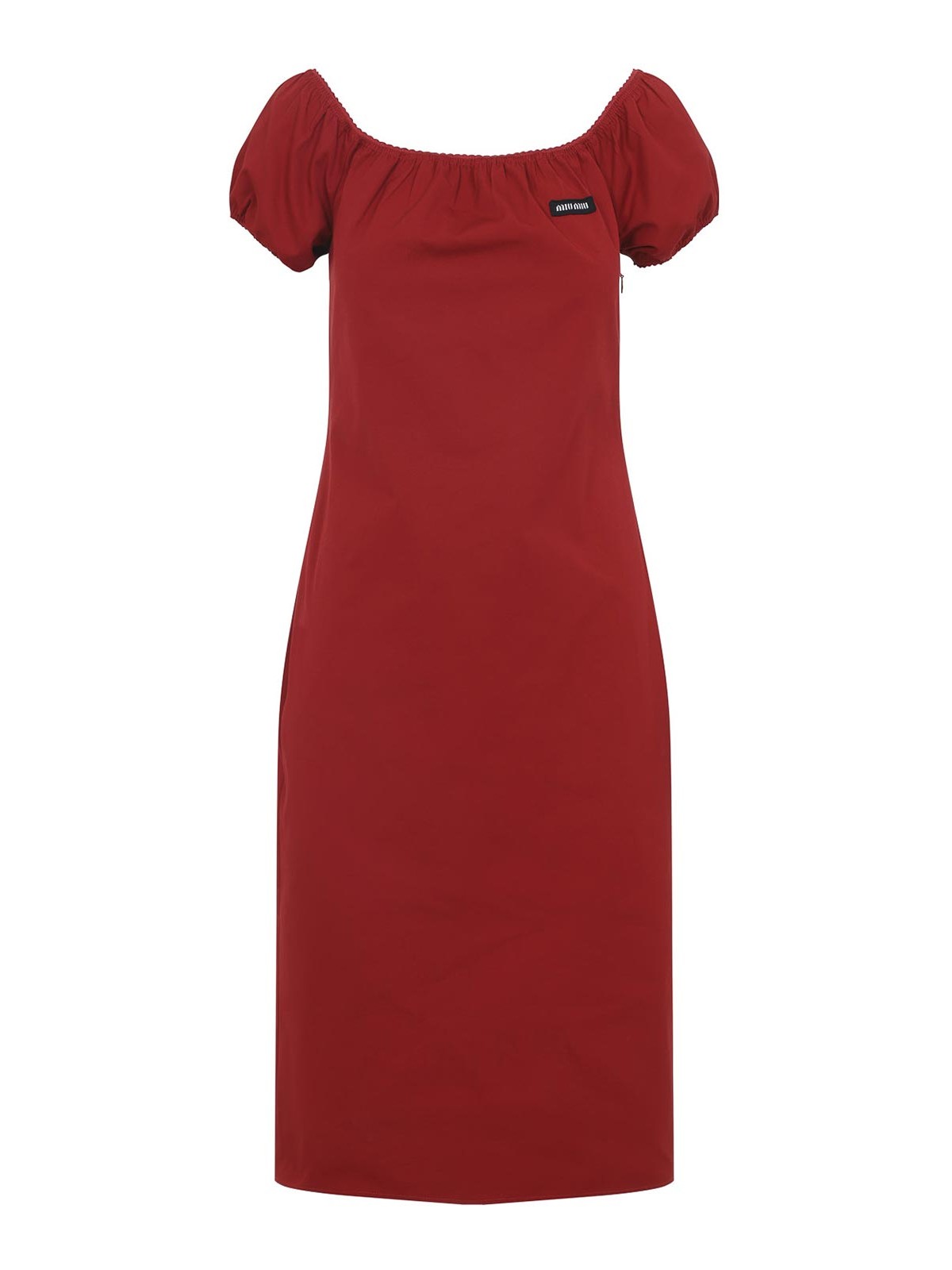 Miu miu red cotton midi dress. crafted from dress cotton, featuring an open round neckline, short balloon sleeves, wrinkle and scalloped hems detailing, a logo patch on the chest, a back concealed zip fastening, a back central vent and a straight hem.