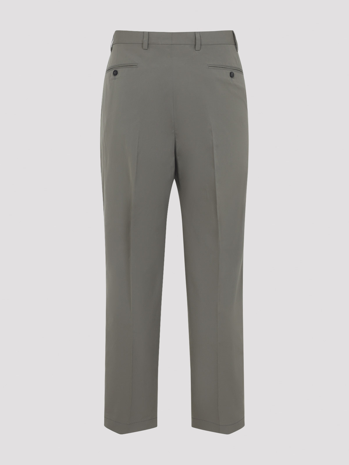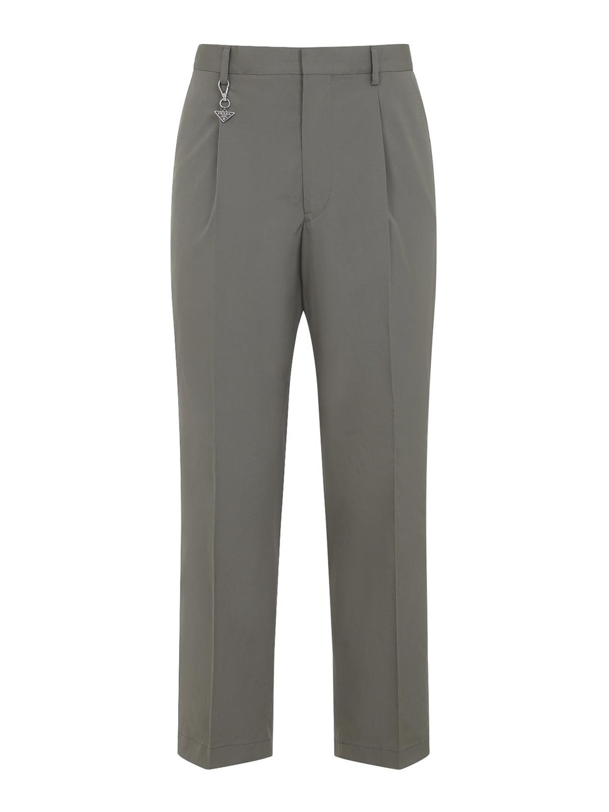Prada green cotton pants. crafted from green cotton, featuring belt loops, front concealed fastening, a detachable prada key ring detail, two front darts, side pockets, two welt pockets on the back, and straight leg.