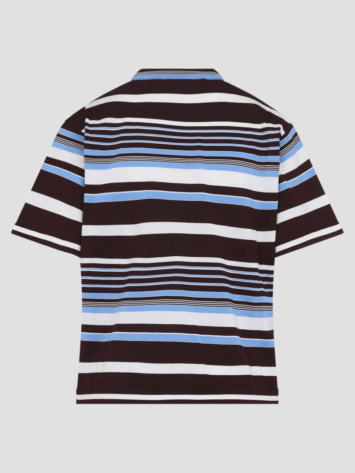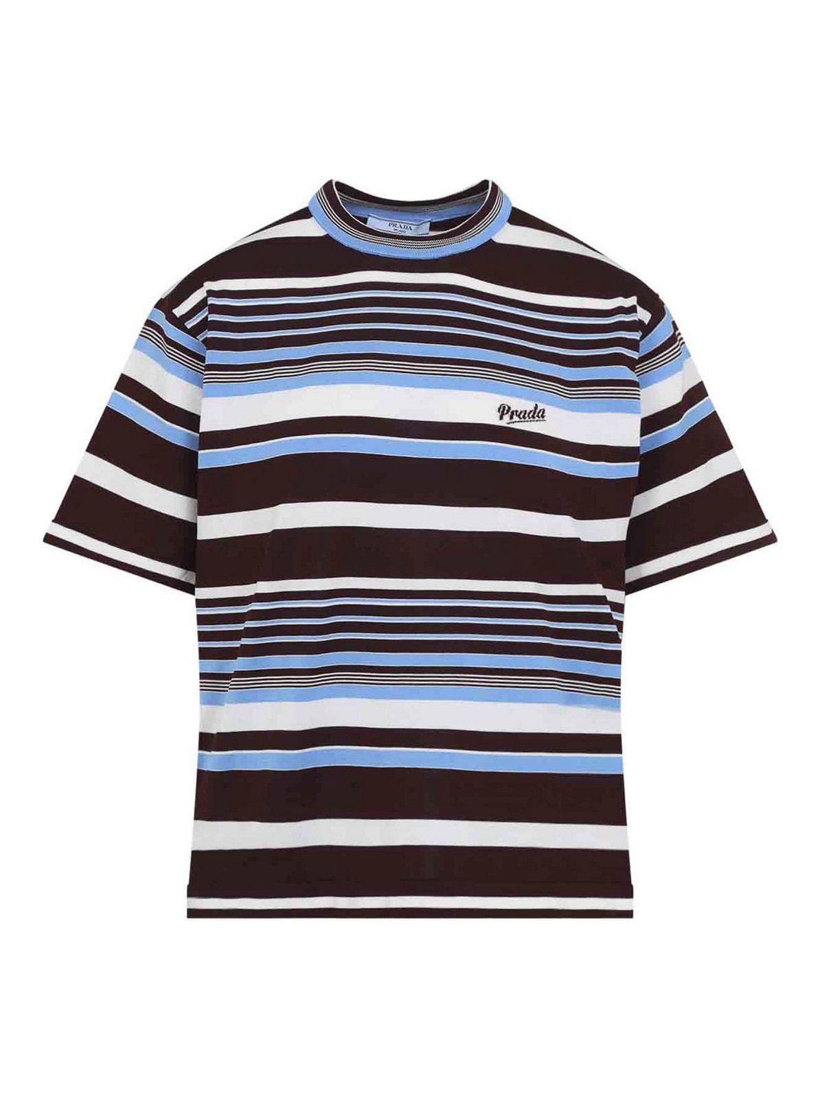 Prada multicolor cotton t-shirt. knitted t-shirt crafted from striped amaranth red, light blue, and white cotton, featuring a ribbed crew neck, a brown logo inlay on the chest, short sleeves, and a straight hem.