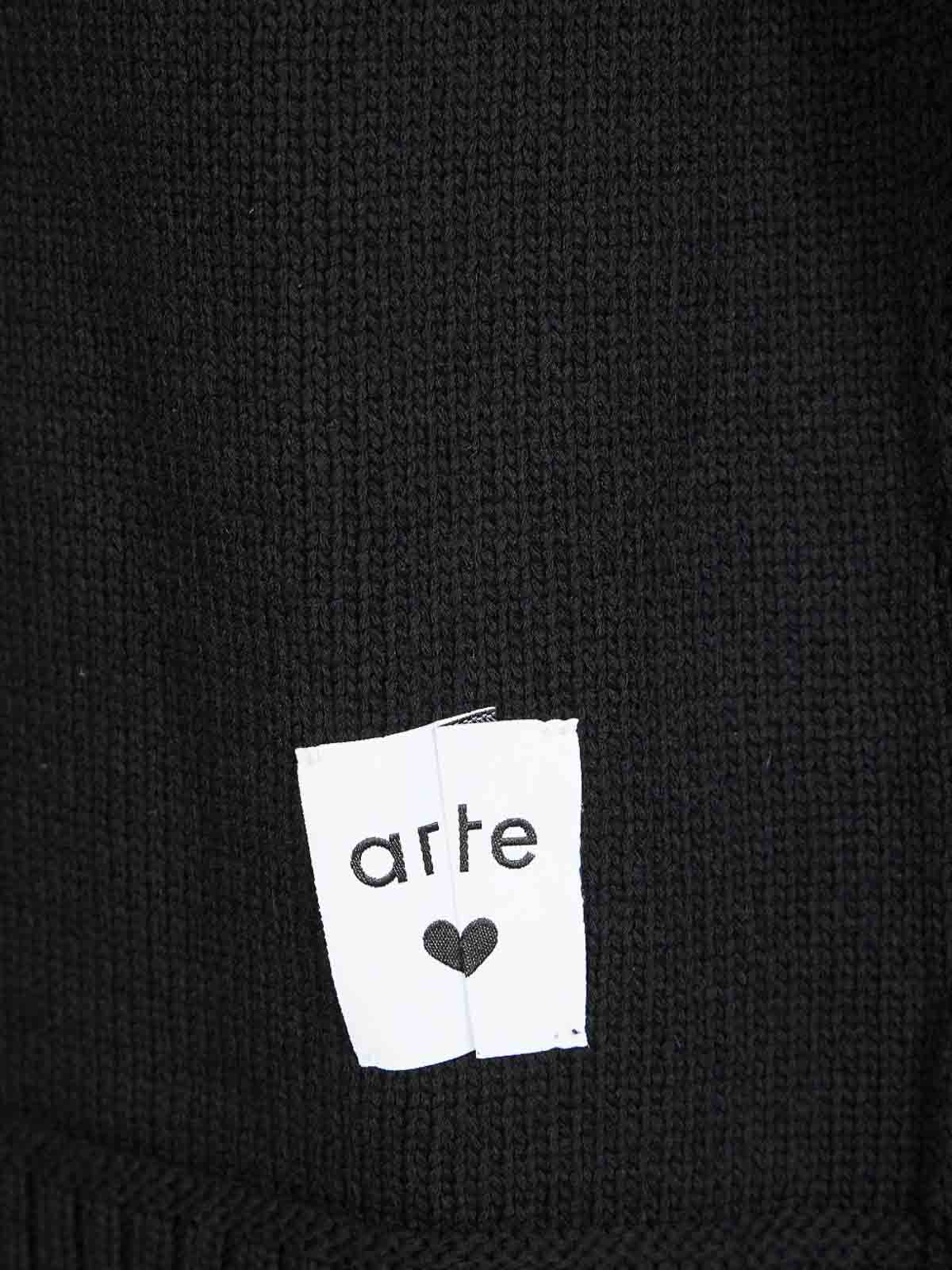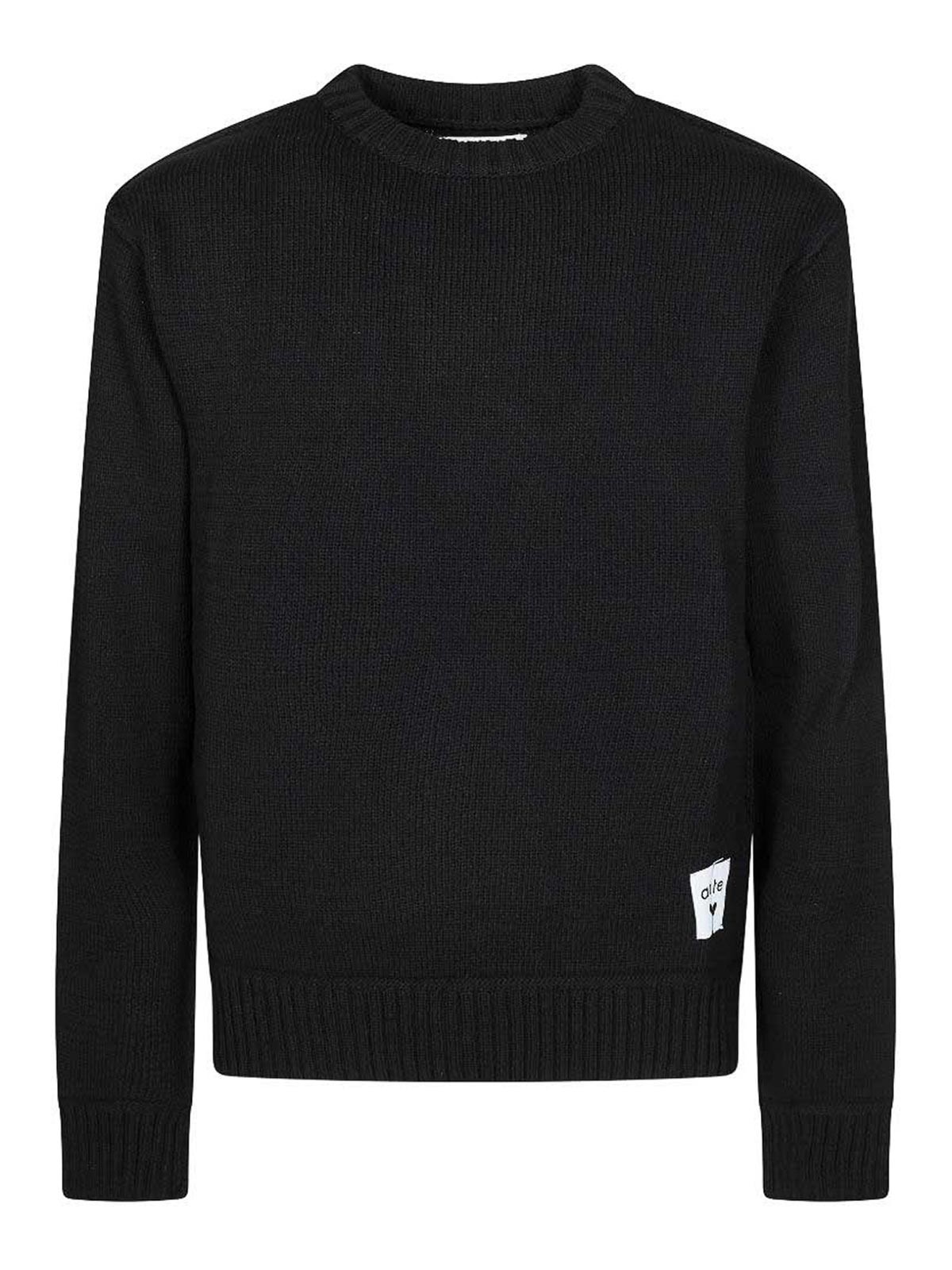 Features black ribbed knit crew neck long sleeves logo label 100% fabric composition.
