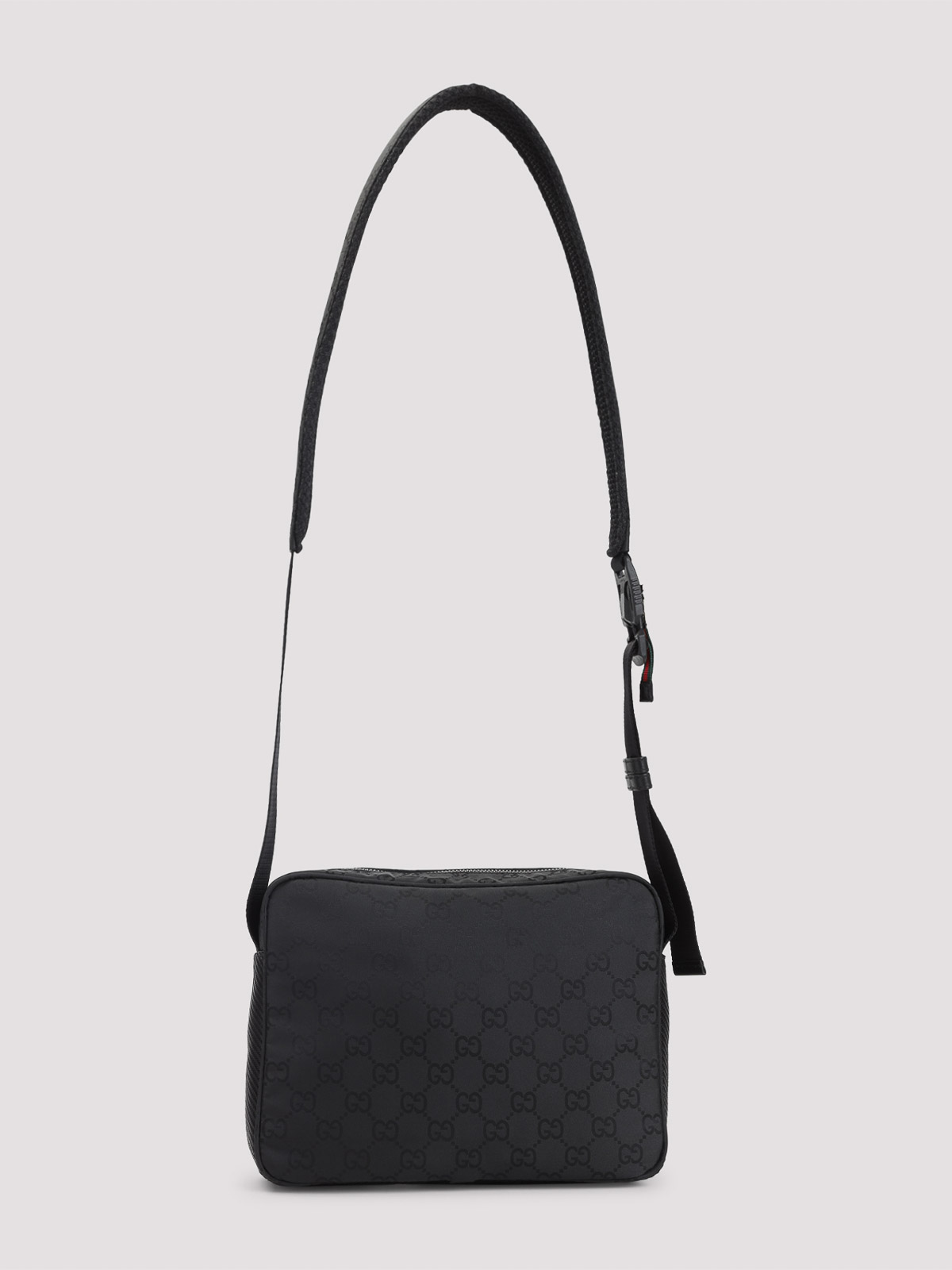 Gucci nexus black polyamide shoulder bag. crafted from black gg nylon, silver-toned hardware, top zip fastening, tonal signature on the front, two zip pockets on the front, one inner zip pocket, adjustable shoulder strap, nylon lining.