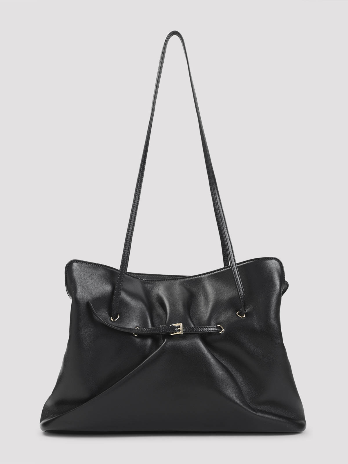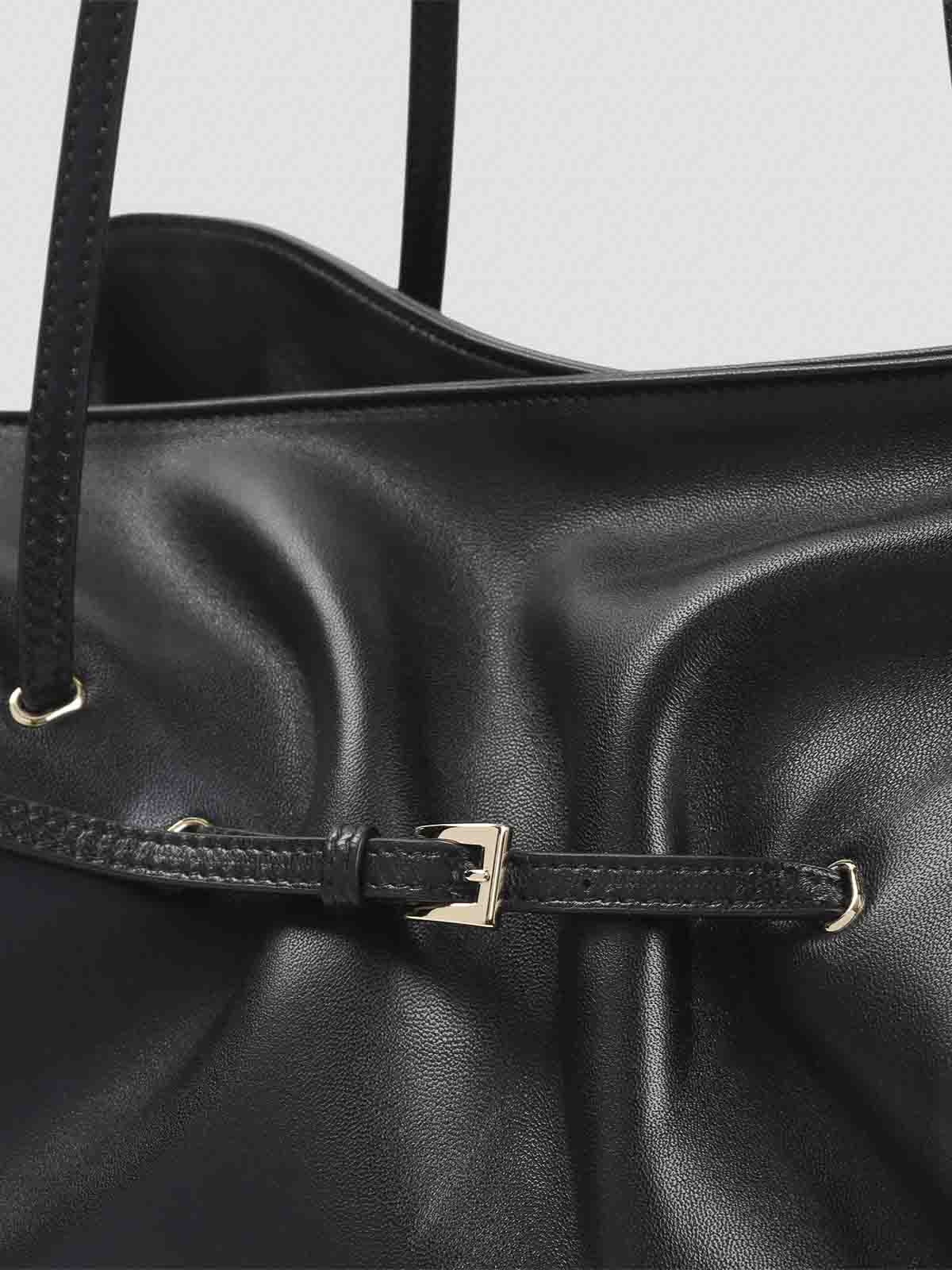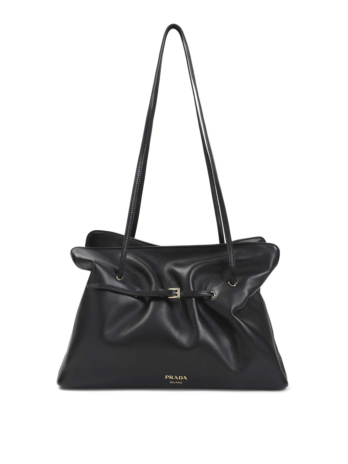 Prada dada black lamb leather handbag. crafted from black lamb leather, featuring gold-toned hardware, a soft gathered construction with a belted detail, top handles, a front logo, a concealed magnetic fastening, and an inner pocket.