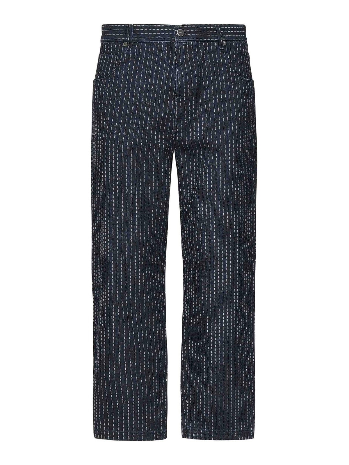 , pocket straight line trousers, finished with custom rivets and buttons, with zip cover, width at the bottom, denim with all over jacquard stitching in beige tones, finished with lettering backing, made in italy, colour indigo raw
