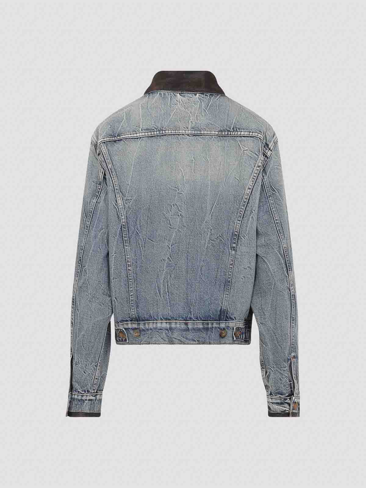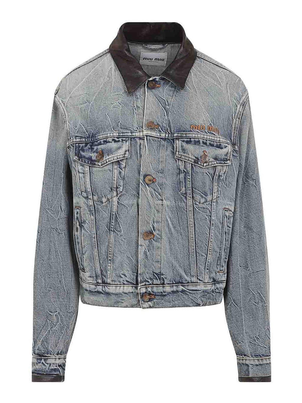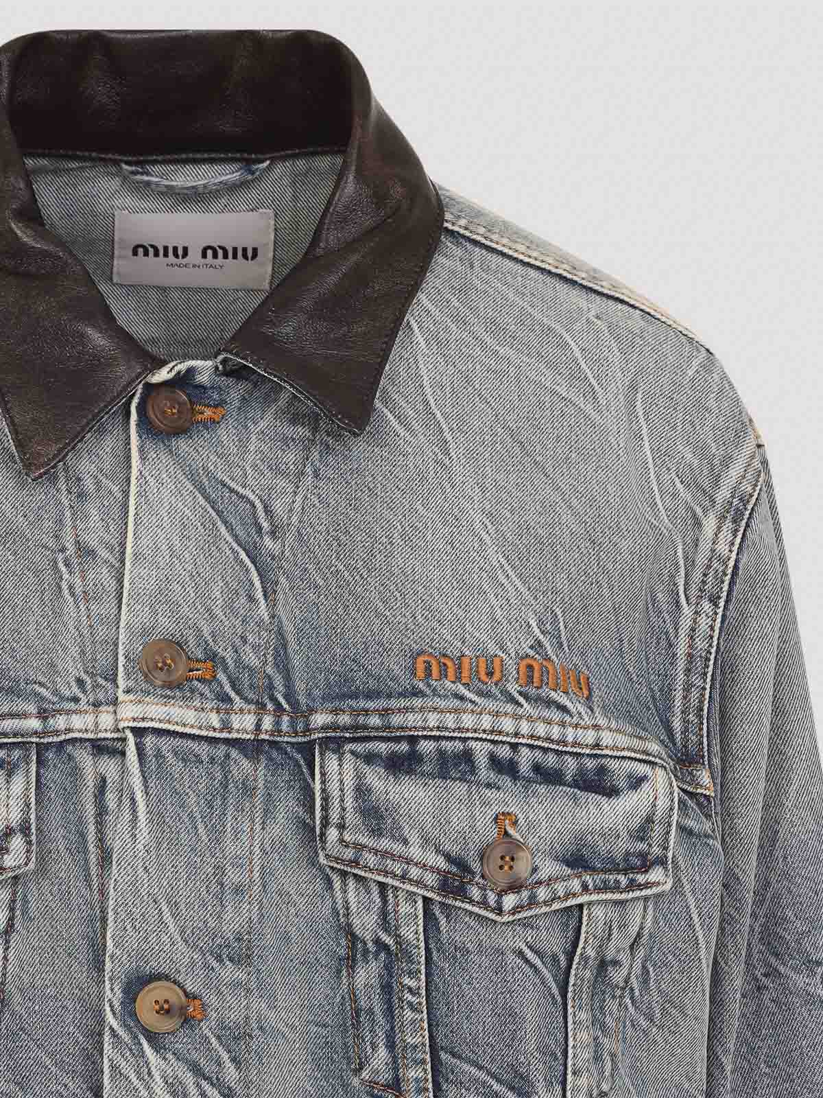 Miu miu light blue cotton denim jacket. pure light blue cotton denim jacket. pointed brown lamb leather collar, front buttoned fastening, chest brown embroidered logo, chest flap buttoned pockets, long sleeves, buttoned cuffs, straight hem. overused and overwashed effect, contrasting stitching.