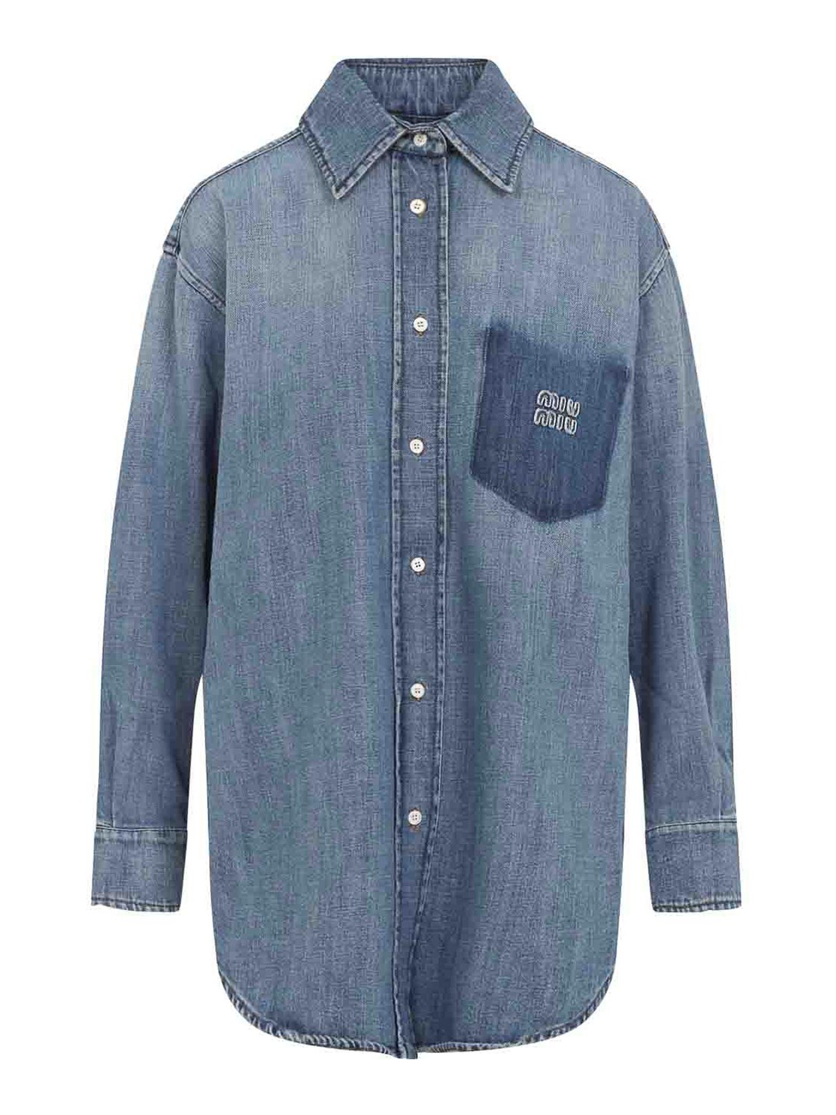 Miu miu blue denim shirt. washed blue cotton denim, pointed collar, front button fastening, logo patched on the breast, dropped shoulders, long sleeves, buttoned cuffs, back yoke, round hem.