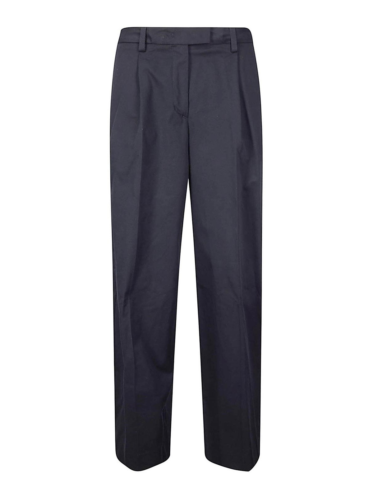 Solid color trousers, pleated, high waist, zip and button closure, wide leg.