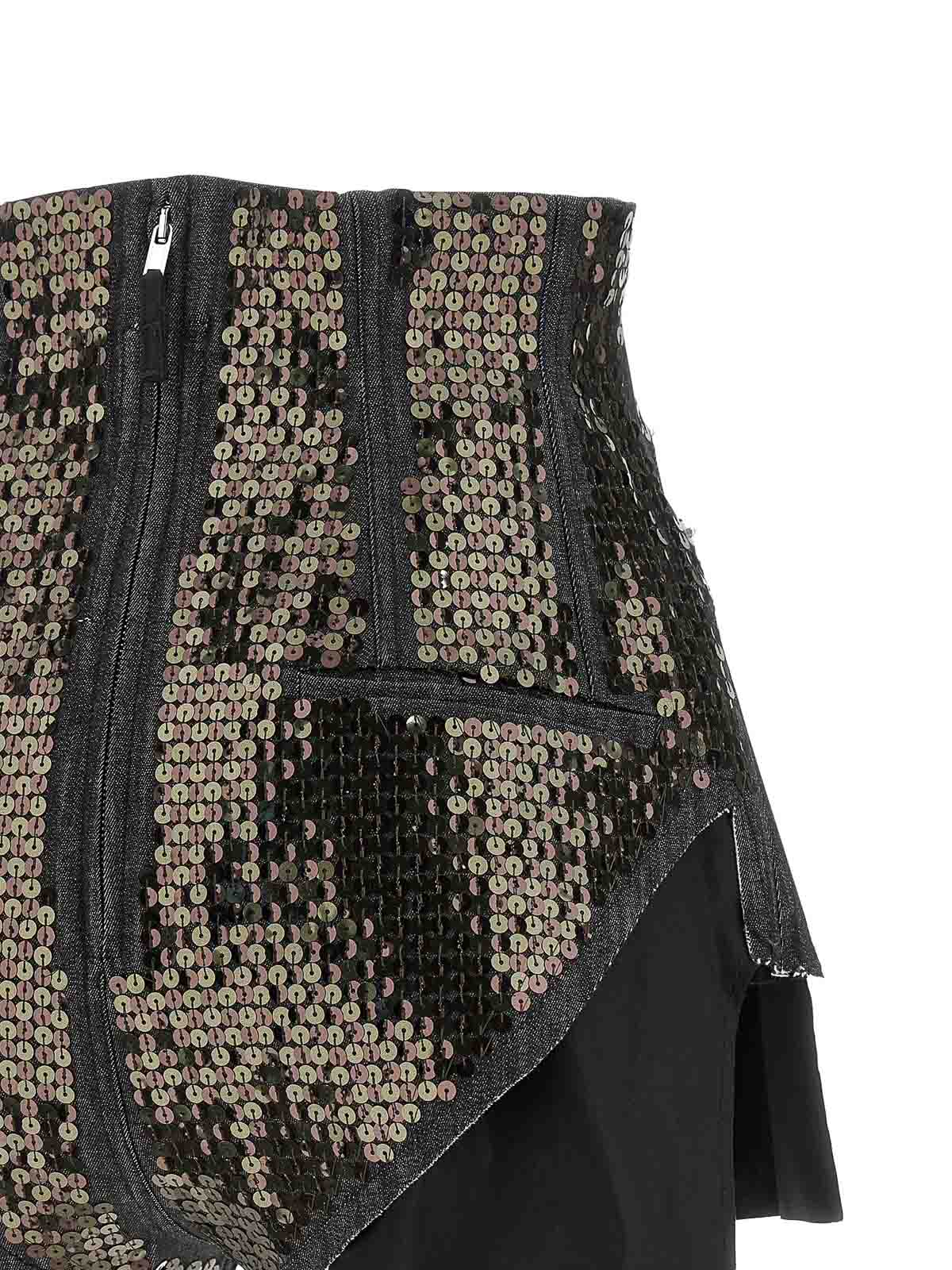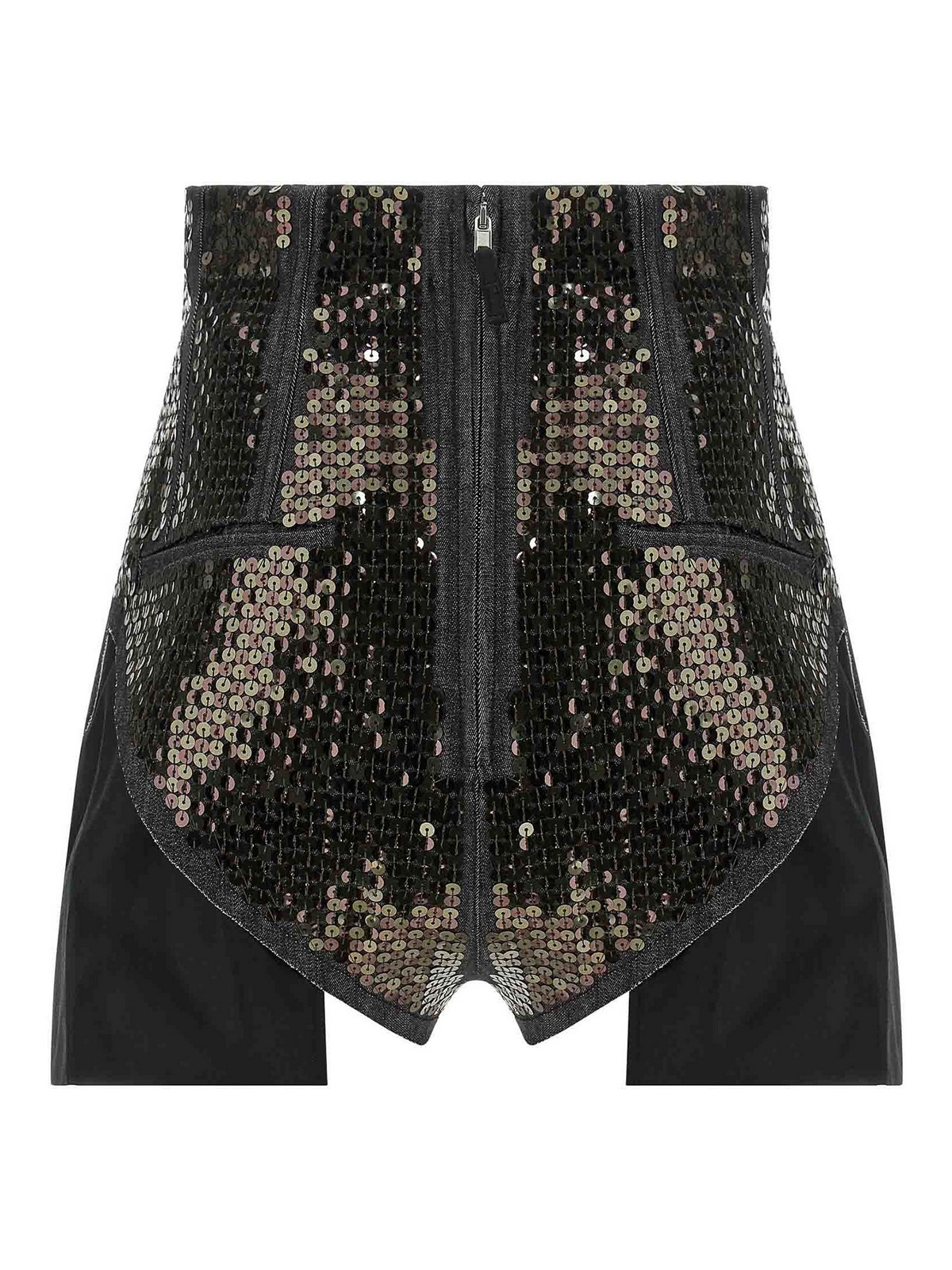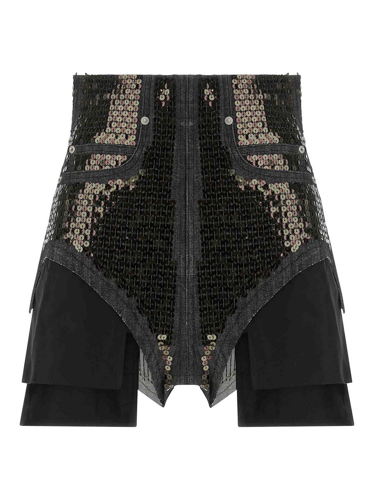 dirt cuoffs' shorts in cotton denim embroidered with all-over sequins, high waist and high cut on the hips with tight fit, jeans-style front pockets with metal rivets, back welt pockets, back closure with metal zip and hook, protruding pocket bags with raw cut hem, overdyed denim and treated with deliberately irregular appearance.