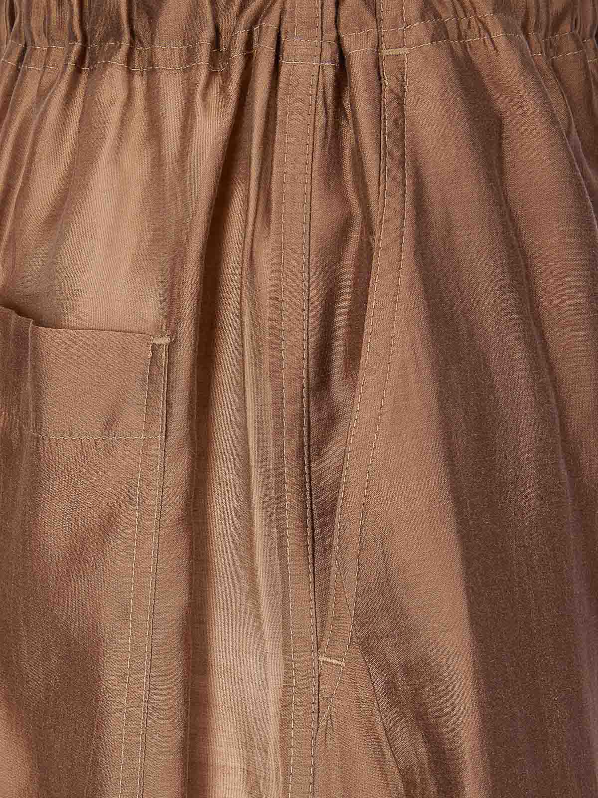 Solid color semi-transparent trousers, high elasticated waist, wide leg, back patch pockets.
