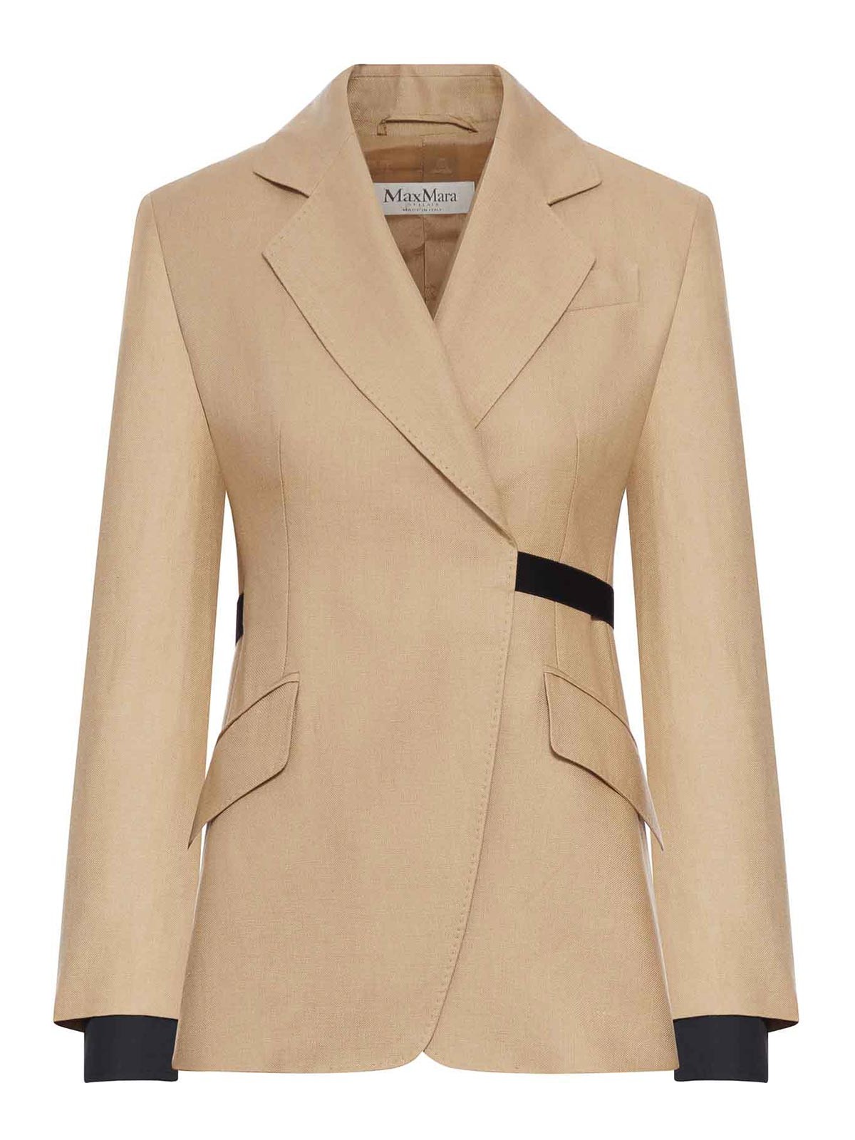 double-breasted blazer, lapel collar, set-in sleeves with vent and button cuffs, removable cuffs, black elastic waistbands that cross on the left hip, snap button closure, stretch linen canvas, iridescent yarn dyed, left welt chest pocket, double-welt pockets with flaps on the front, side slits on the back, finished with a tailored tack, stretch monogram lining, slim fit, color: sand