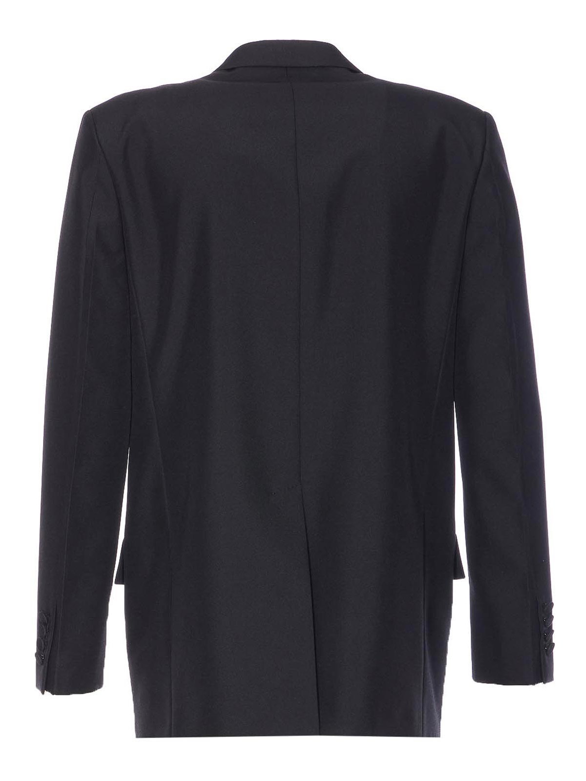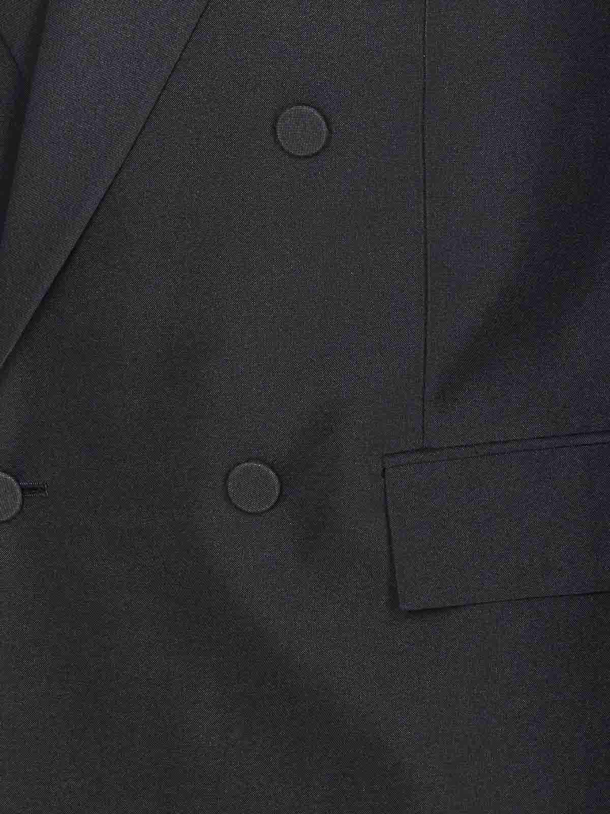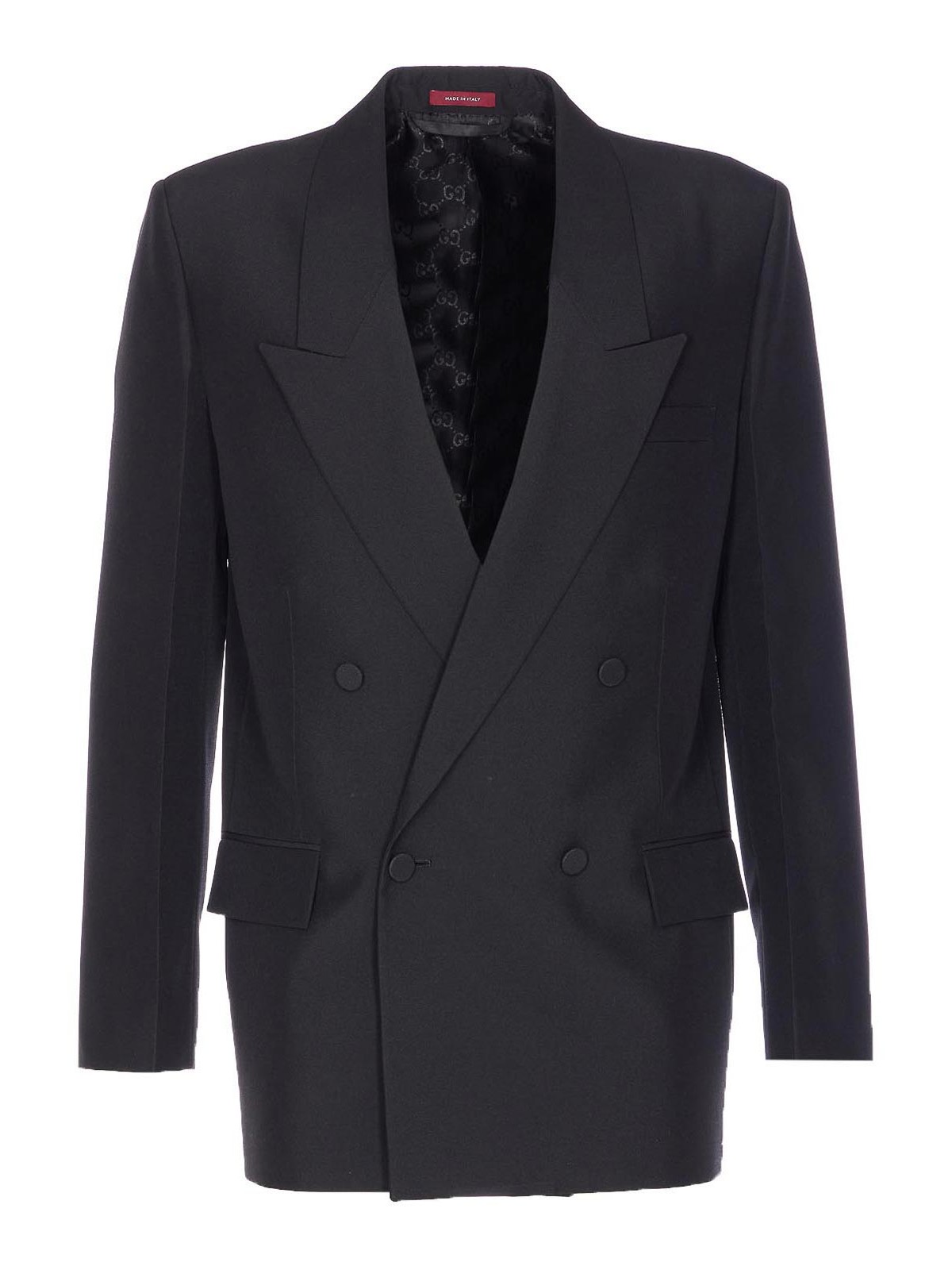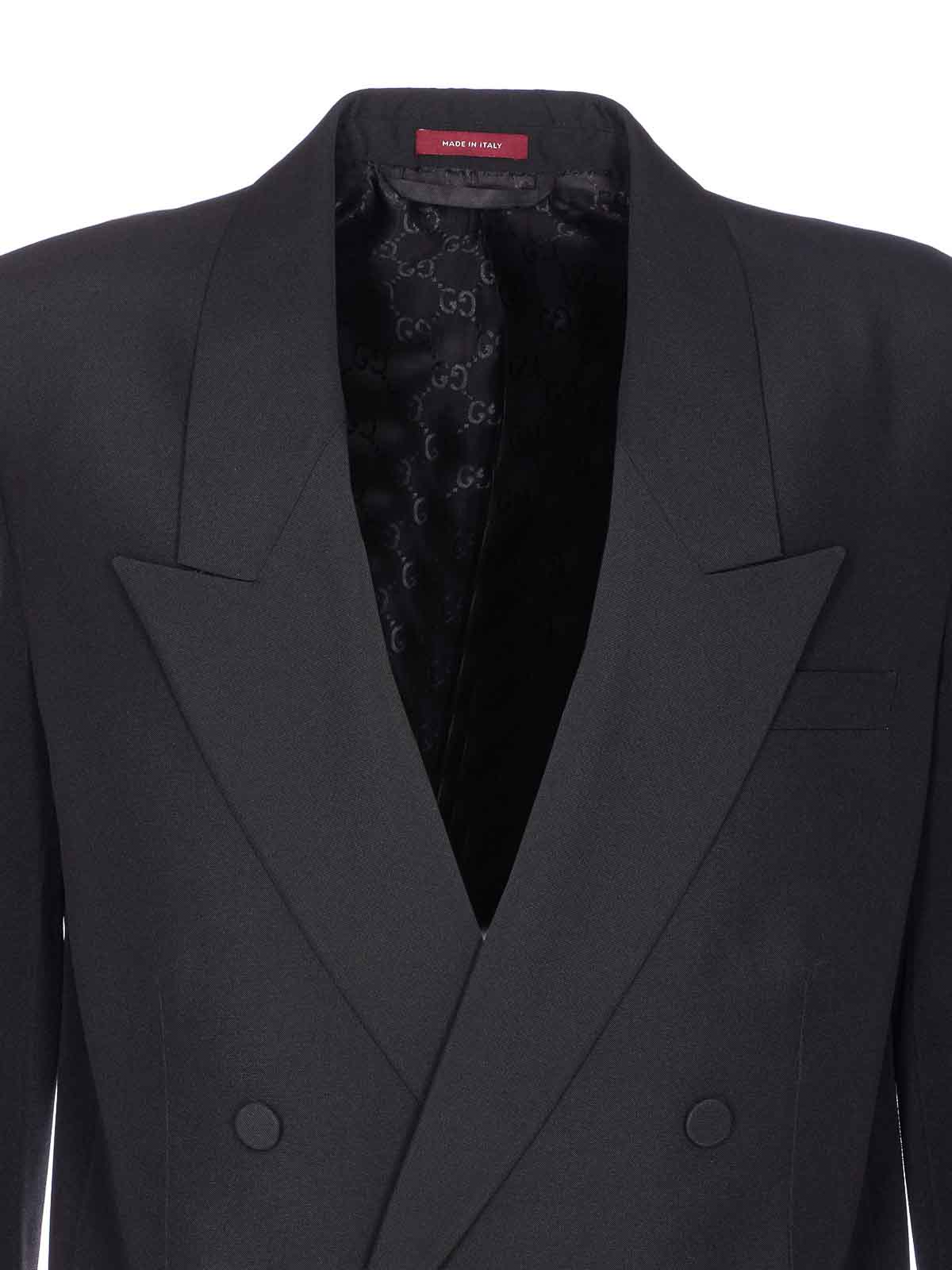Gucci black double breasted jacket with buttons closure, long sleeves, v-neck, reverse detail, reinforced shoulder, buttons on cuffs