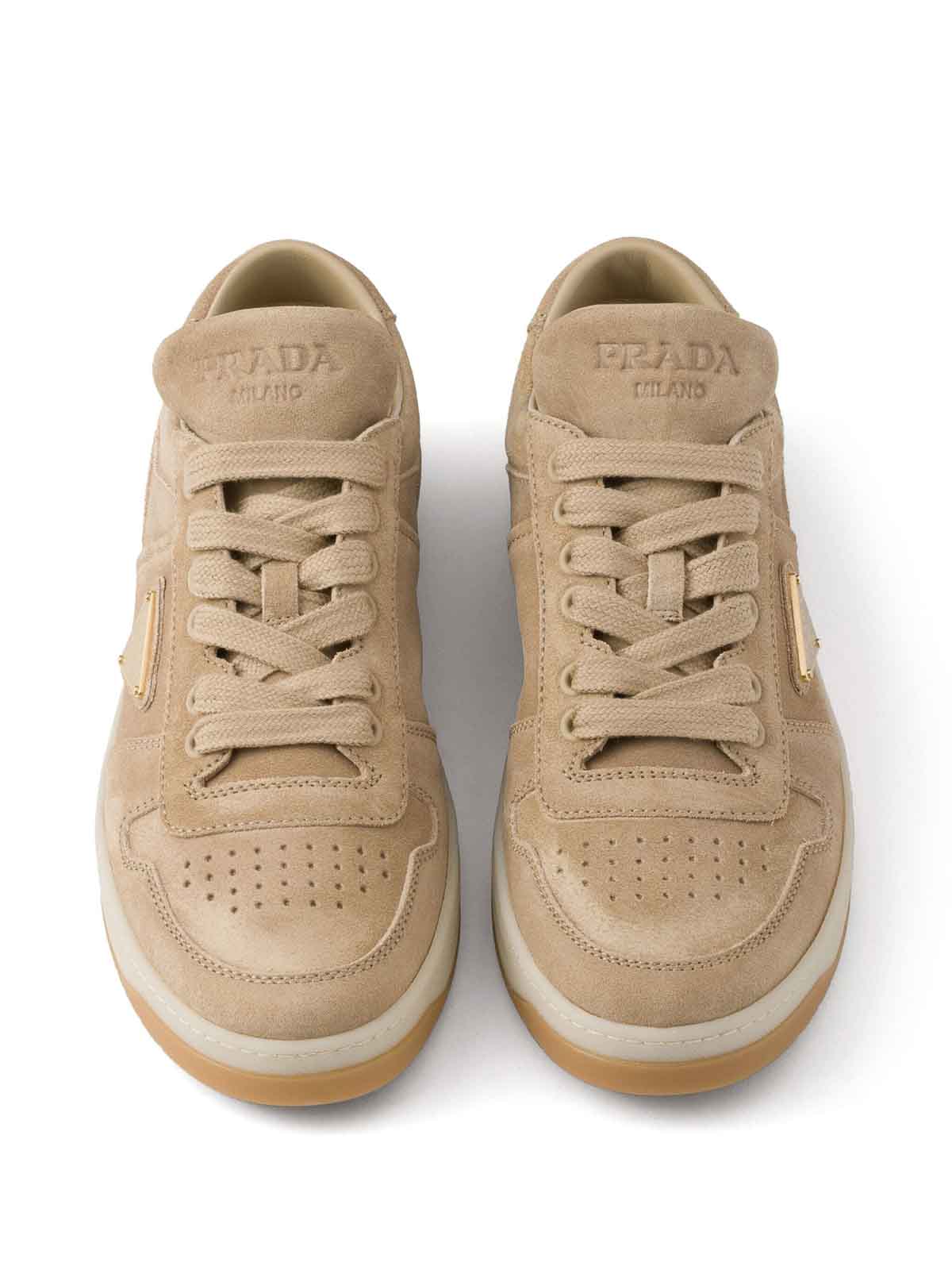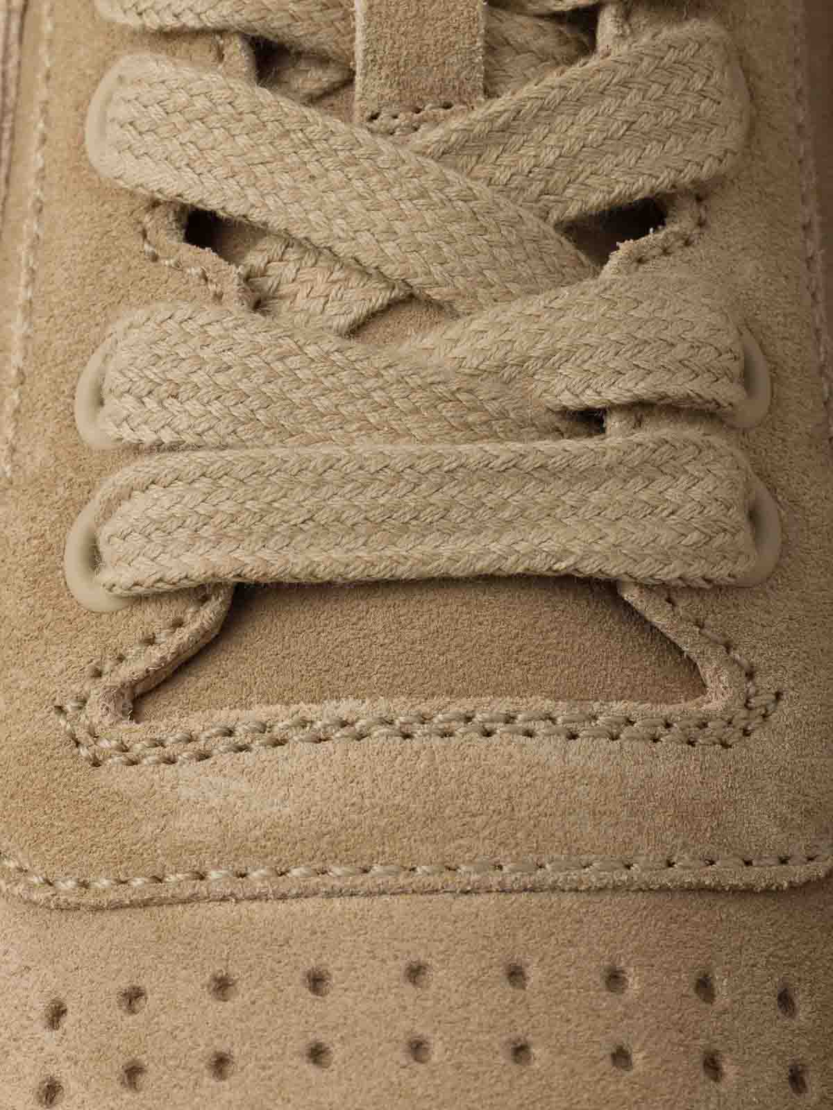 almond beige panelled design triangle logo logo, debossed tongue round toe lace, up perforated toebox branded counter branded in flat