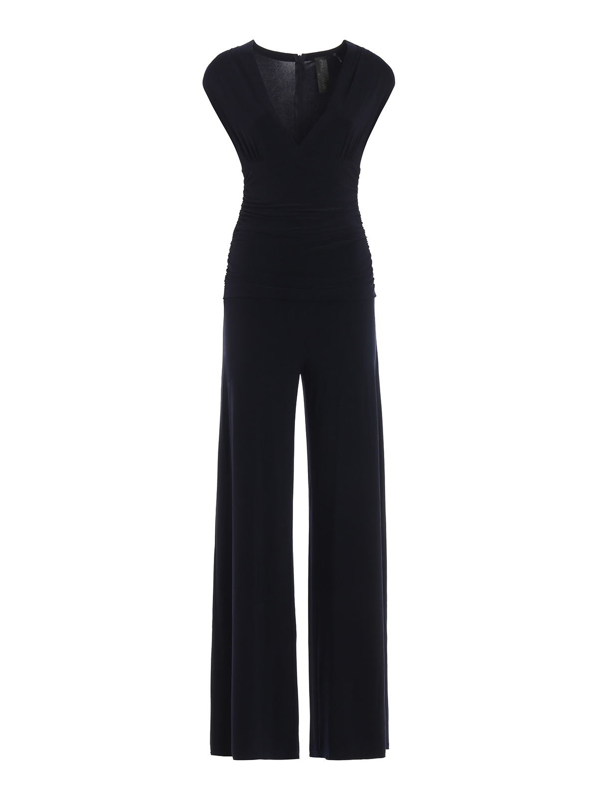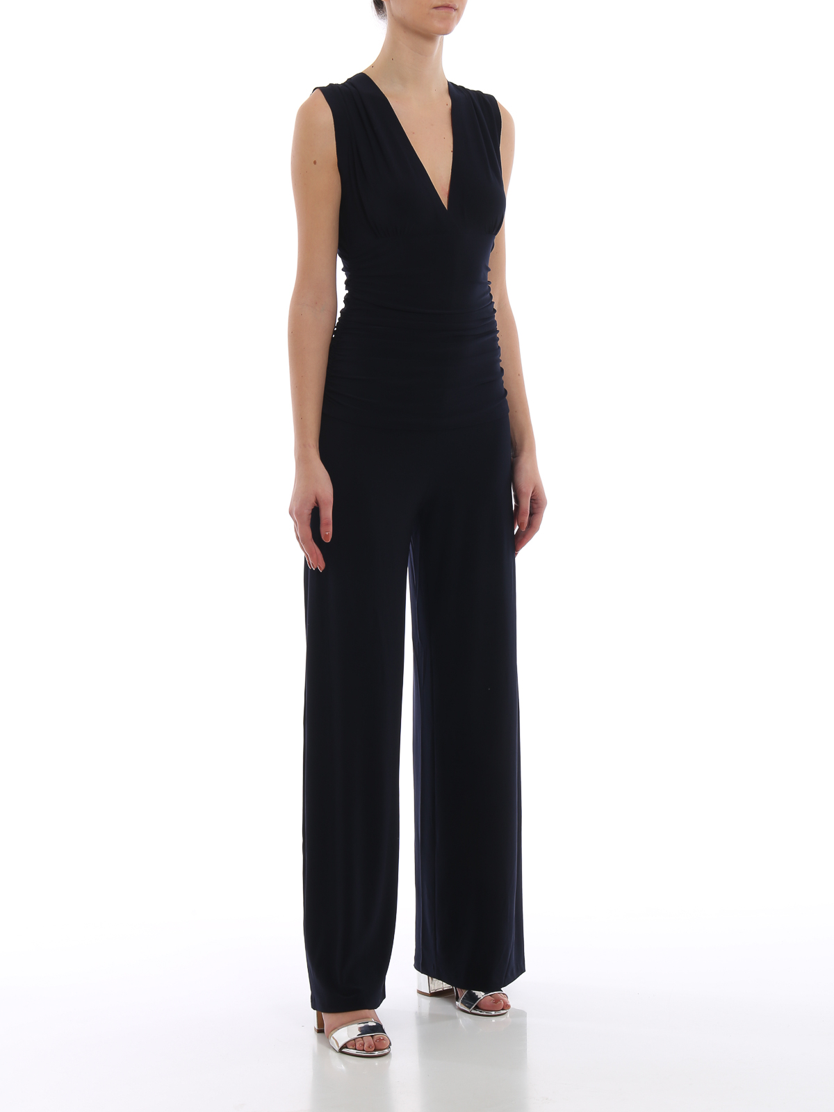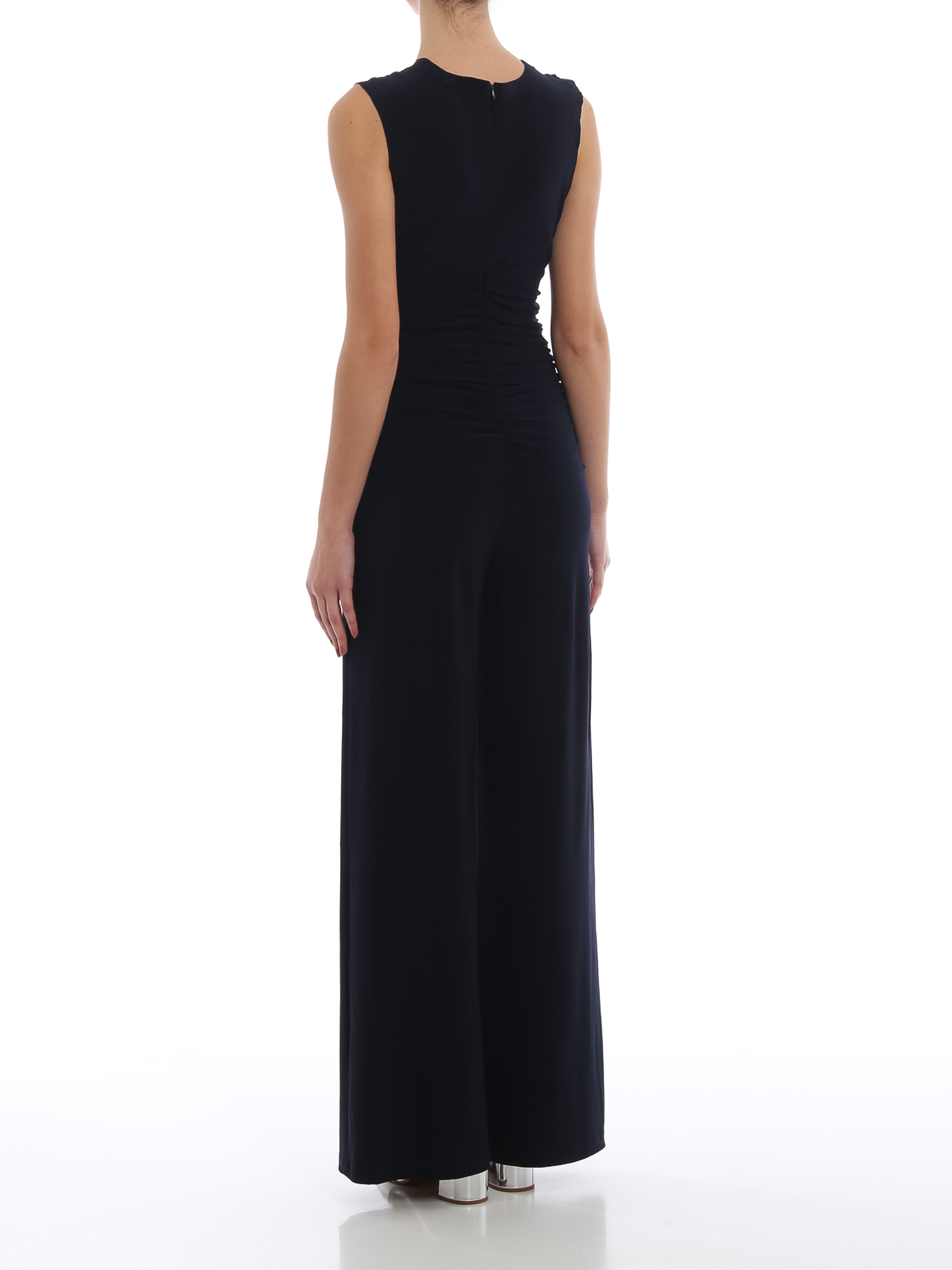 Stretch fabric sleeveless jumpsuit in a plain colour featuring a round neck, a draped shirred top, wide palazzo pants and a concealed zip fastening to the back.