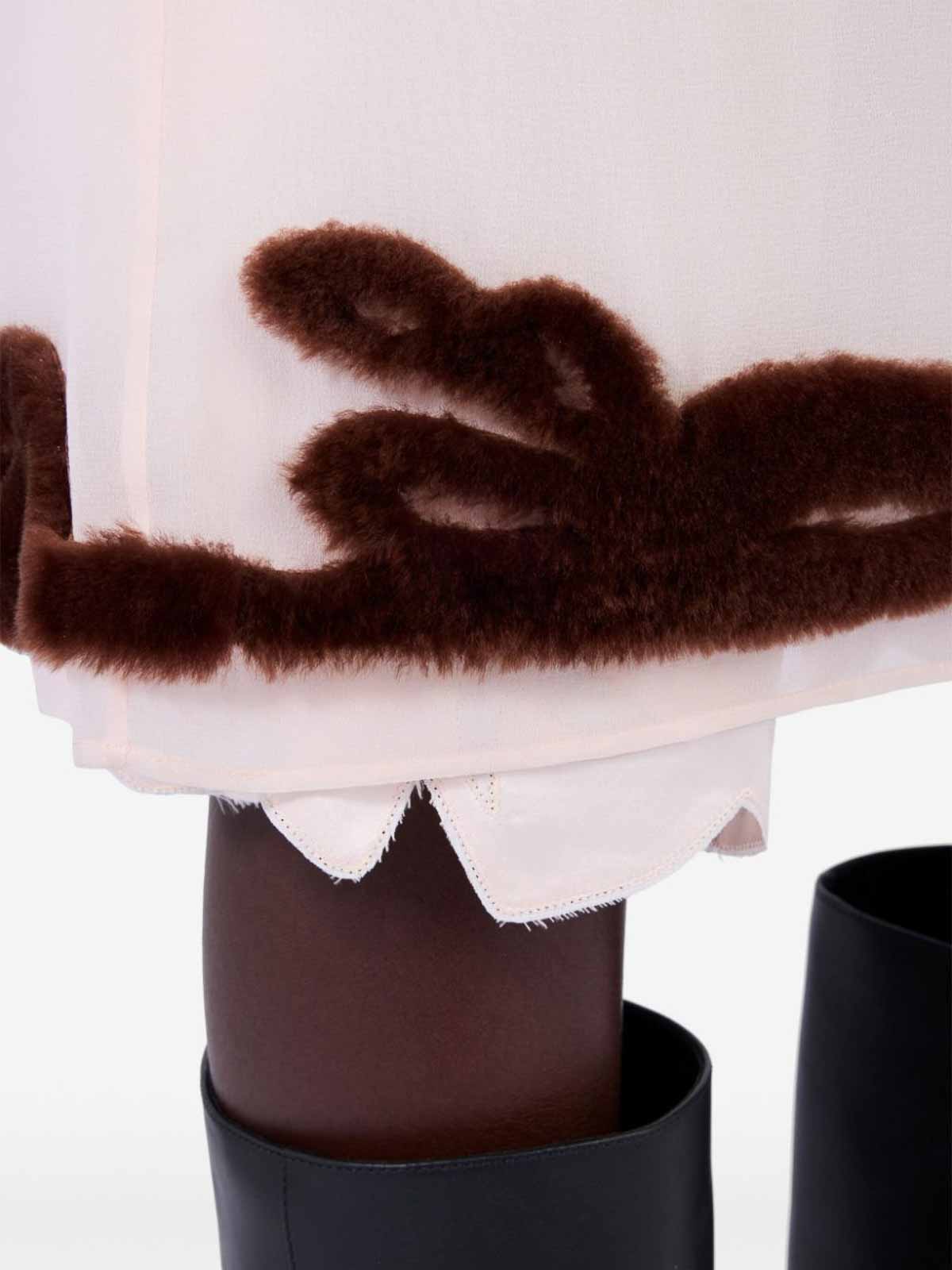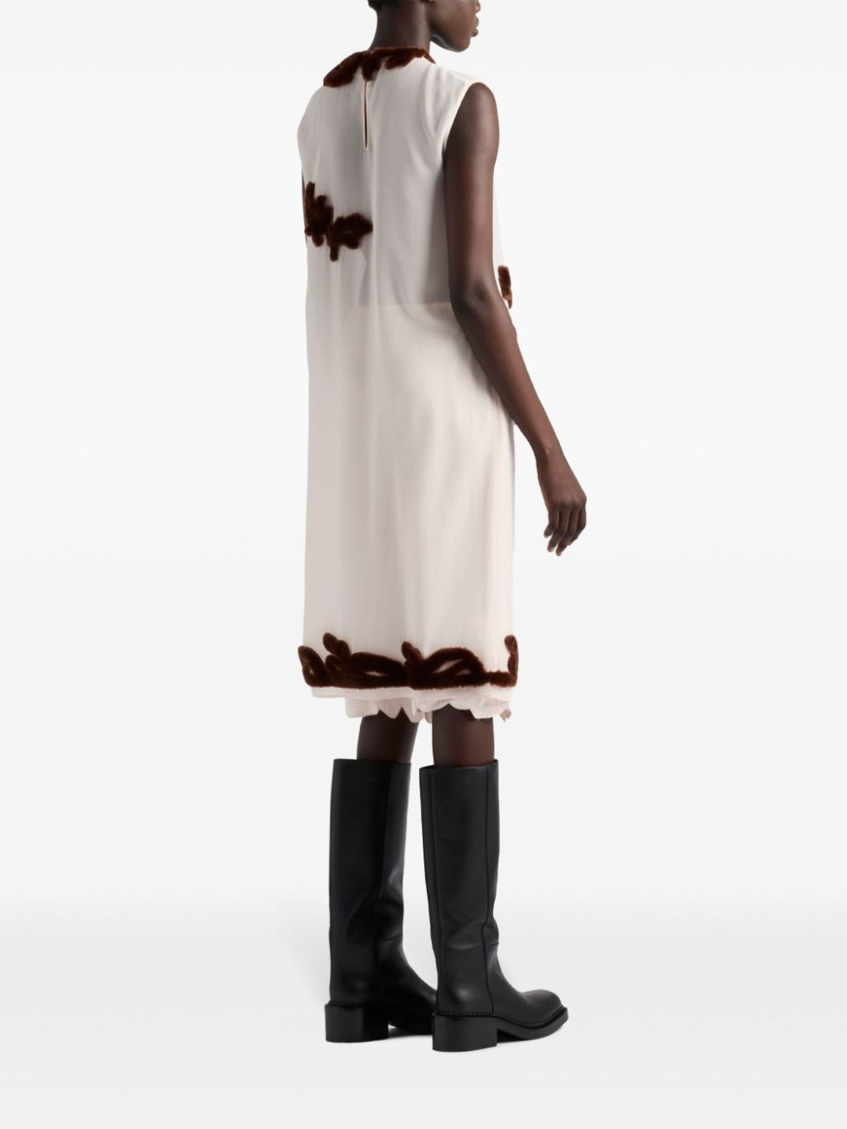 Elegance of the past inspires this georgette dress that establishes a dialogue between the s silhouette and refined retro, inspired embellishments reinterpreted with masterful workmanship for an effect in relief with contemporary charm ivory / brown straight fit with slip round neck button at the back of the neck sleeveless straight hem