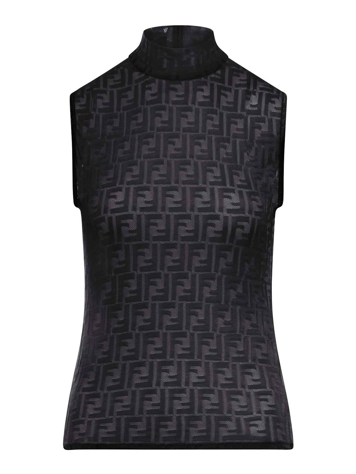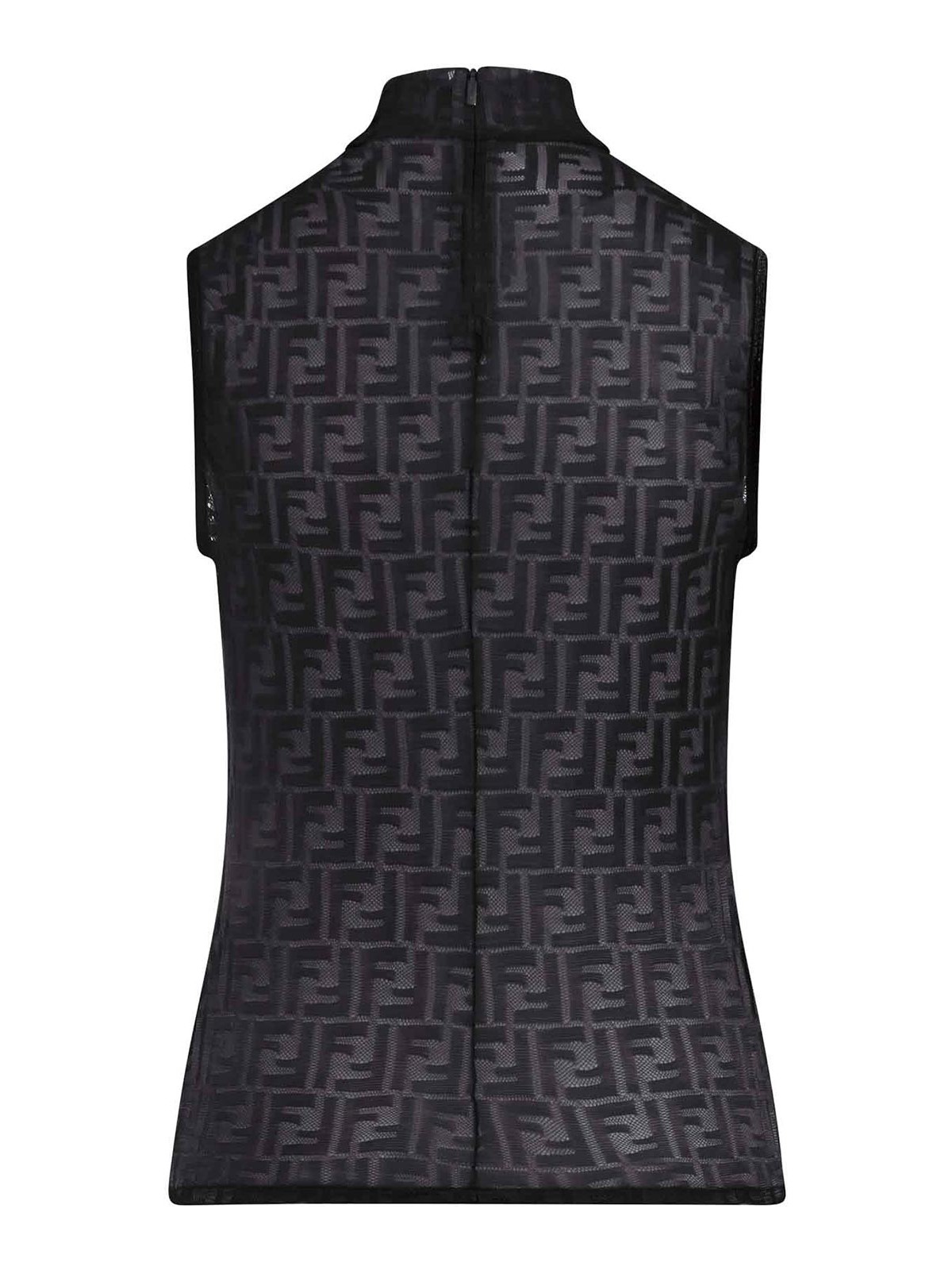 sleeveless top, high neck, fitted, made of black jersey lace, iconic all-over ff motif, sheer effect, unlined, color: black