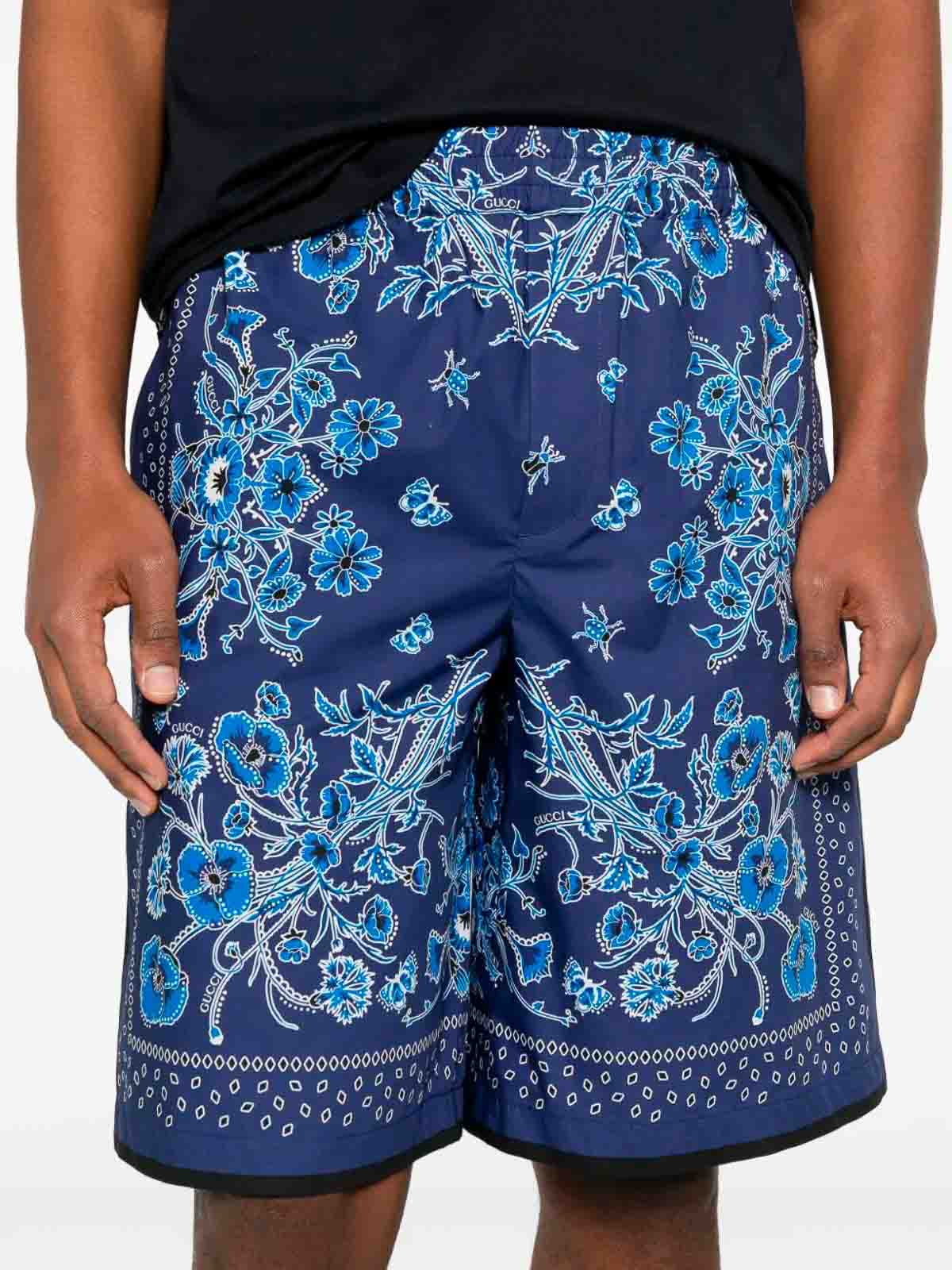 This garment characterized by a bohemian spirit, with colorful prints and relaxed silhouettes, these shorts, made of blue cotton poplin, feature an all-over bandana print, blue cotton poplin, all-over floral bandana print and Gucci logo print, elastic waist with drawstring, two side pockets, two back pockets
