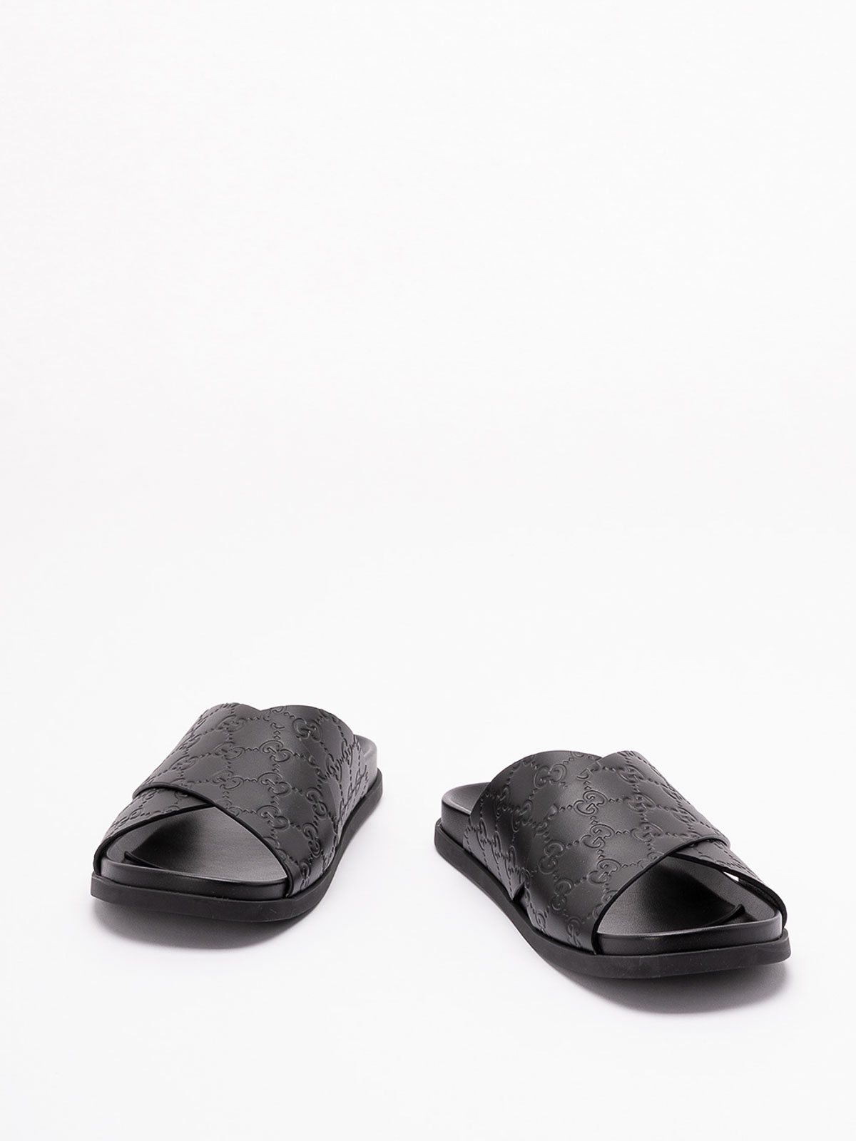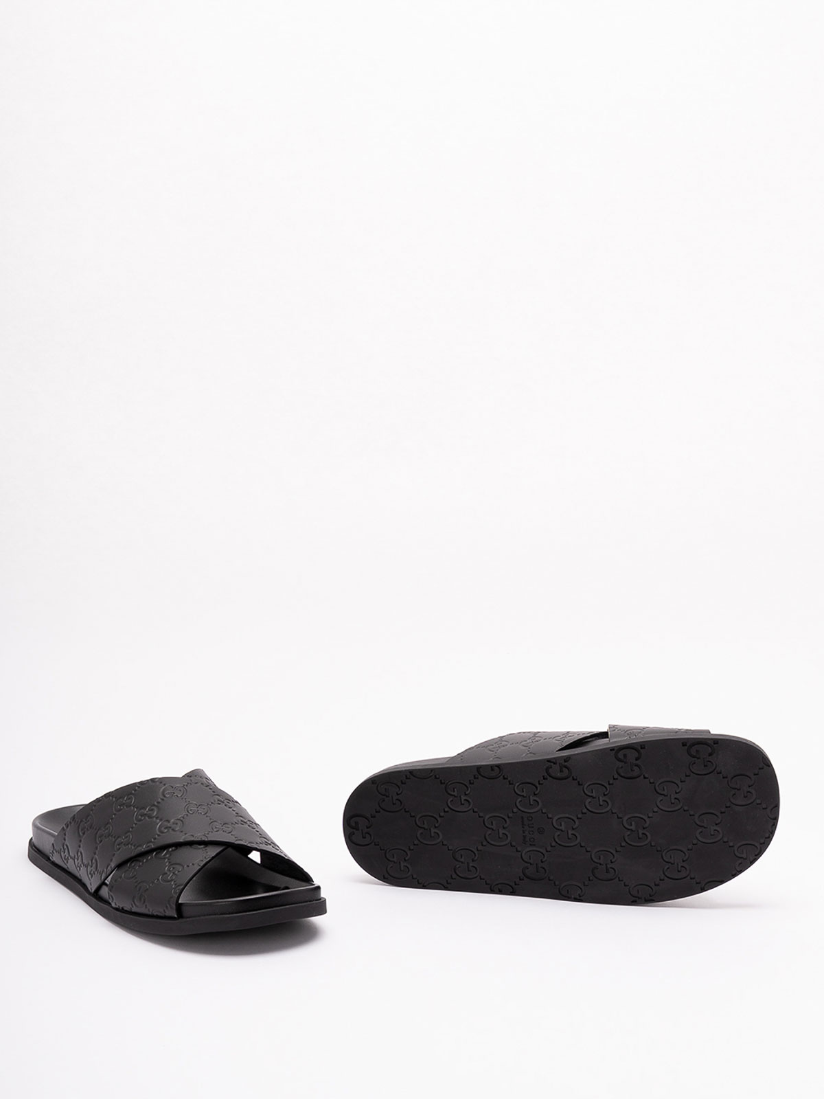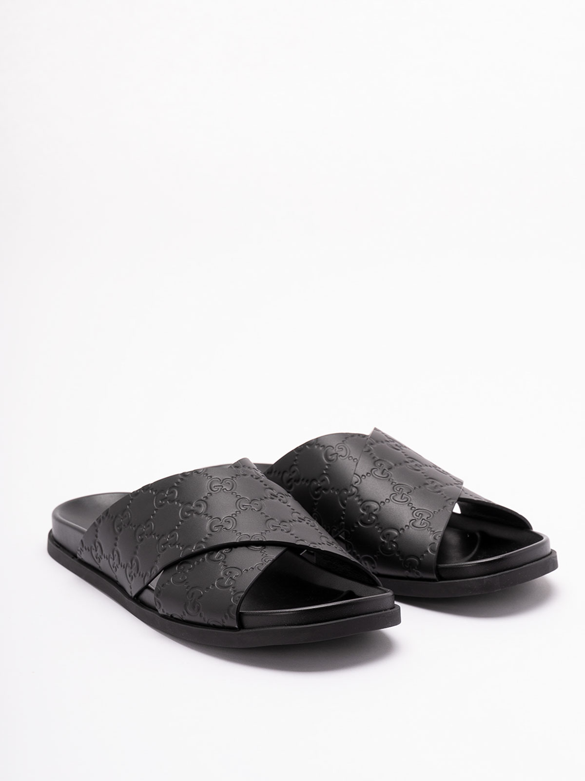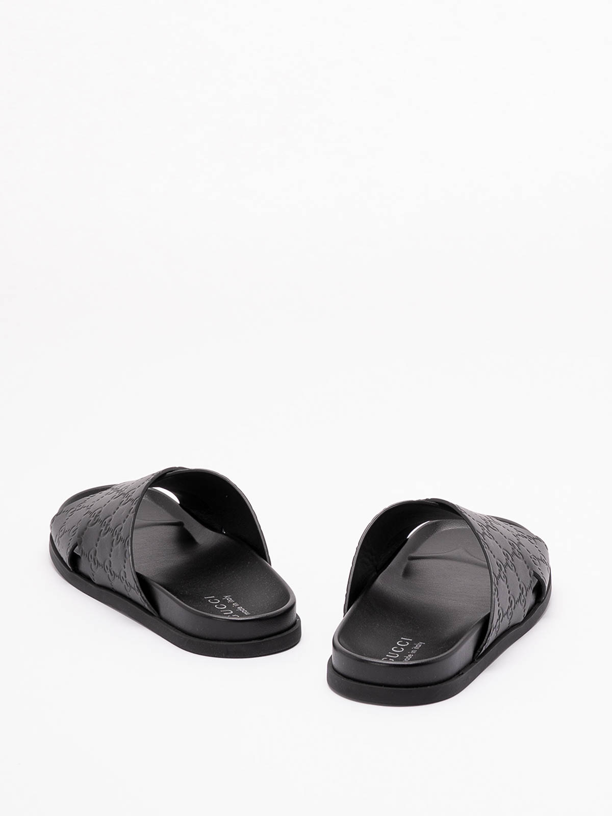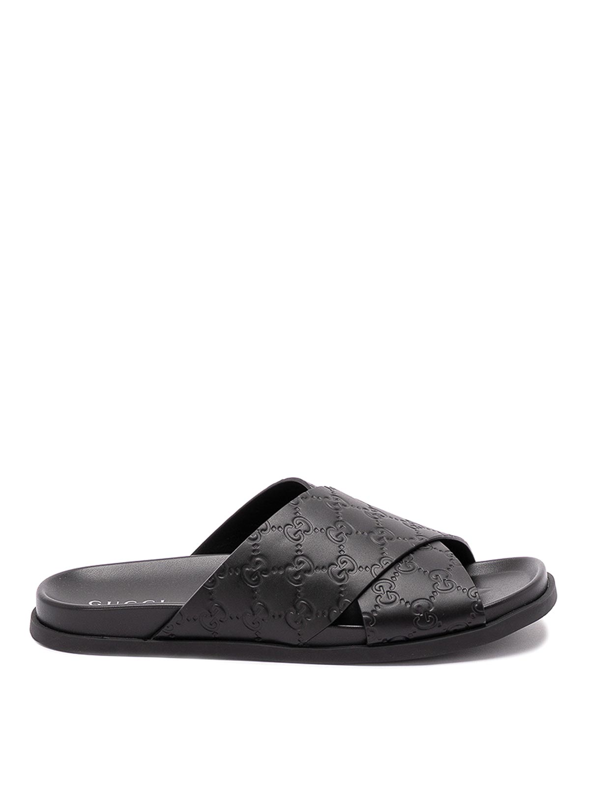 GG criss-cross leather sandals with flat sole and logo detailing.