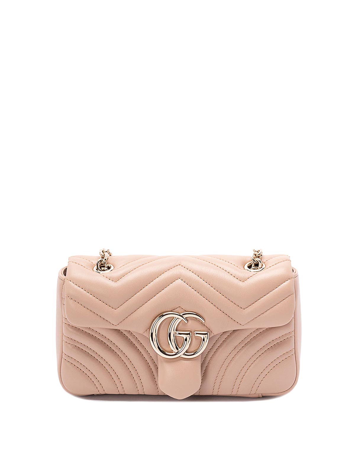 Compact GG Marmont shoulder bag with matelassé leather, chain strap and flap closure.