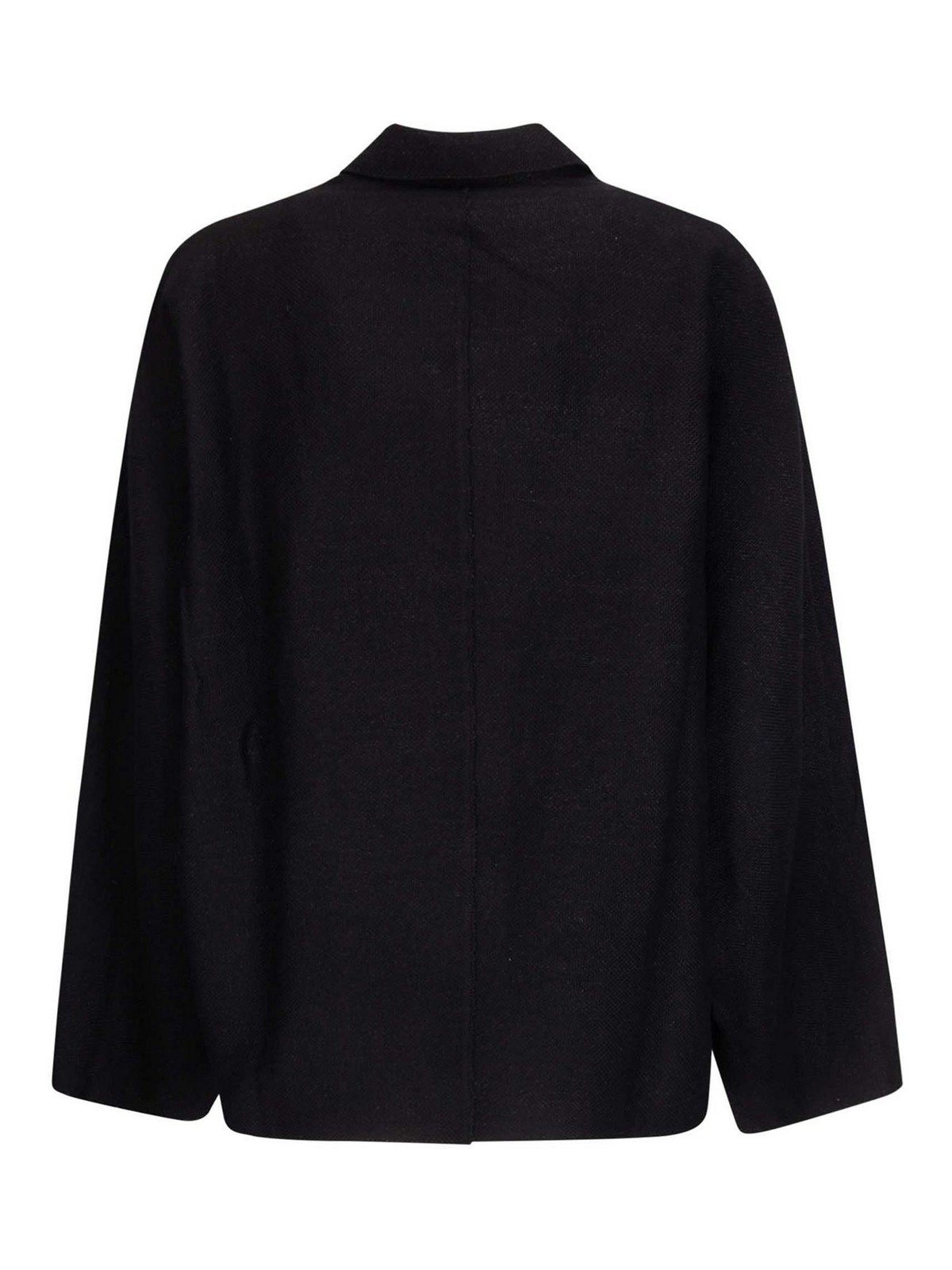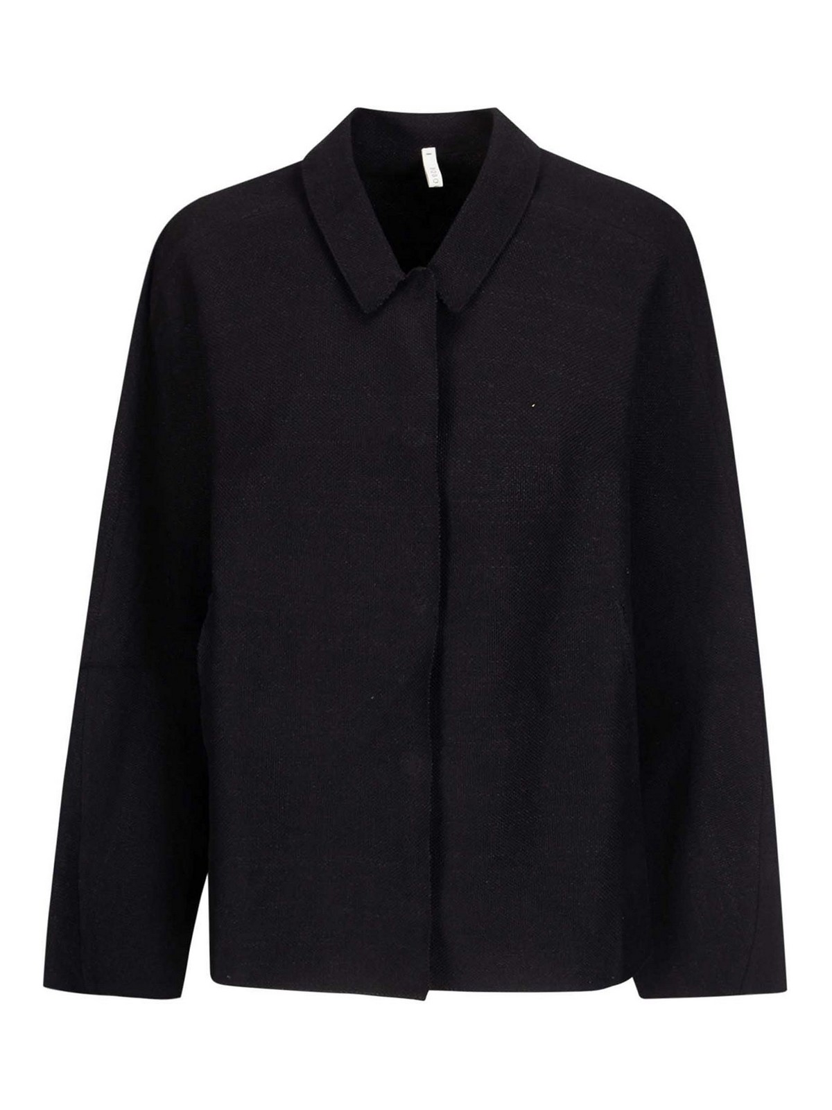 Cotton and linen jacket with shirt collar, hidden snap button closure, three-quarter length sleeves without shoulder seam.