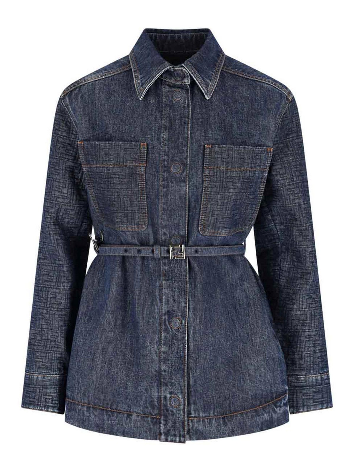 Fendi ff denim jacket, in blue cotton, ff jacquard motif on sleeves and pockets, classic collar, front button closure, adjustable belt at the waist, ff logo detail in silver metal on the front, two flat pockets on the front, contrasting leather logo tag on the back, straight hem.