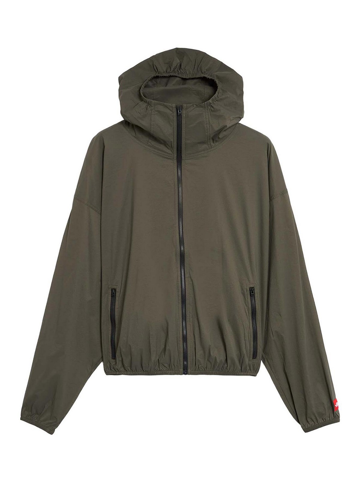 Zip closure, with hood, packable, zip pockets on the front, logo patch, elasticated bottom, 100% nylon.