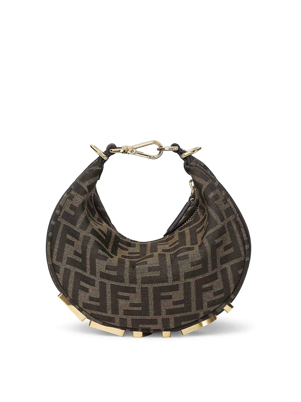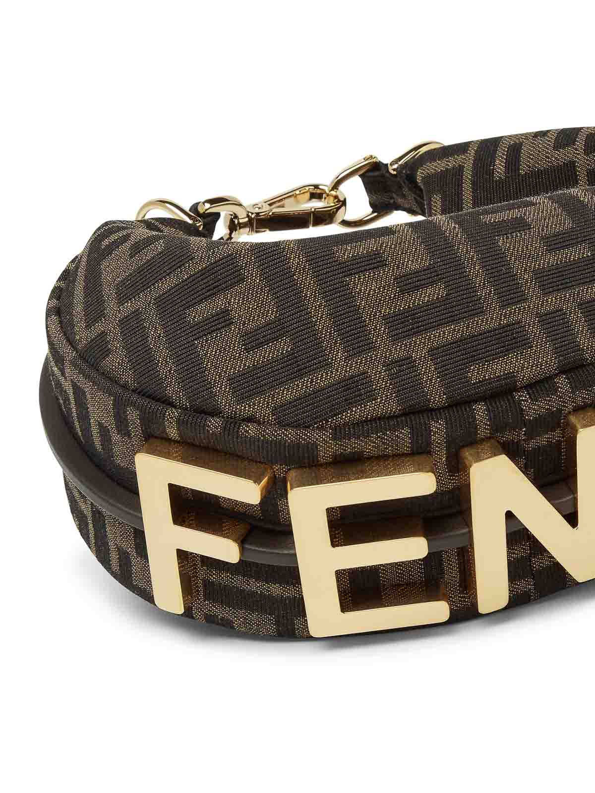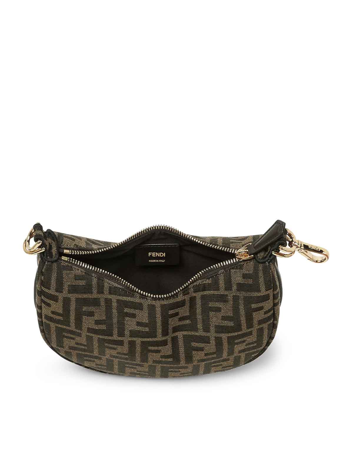 mini hobo bag, fabric, jacquard ff motif in shades of brown, fendi lettering in vintage gold metal, zip closure, fabric-lined interior compartment, gold-finish metal hardware, can be carried by hand thanks to the hook and snap hook that can be used as a handle, or cross-body with the thin, adjustable and removable shoulder strap, holds a 6.2-inch smartphone, a card holder or mini trifold wallet, keys, and lipstick, height: 13 cm, depth: 7.5 cm, width: 20 cm, weight: 0.38 kg, shoulder strap length (min): 91 cm, shoulder strap length (max): 94 cm, shoulder strap drop: 54.5 cm, color: tobacco/dark brown/ebony