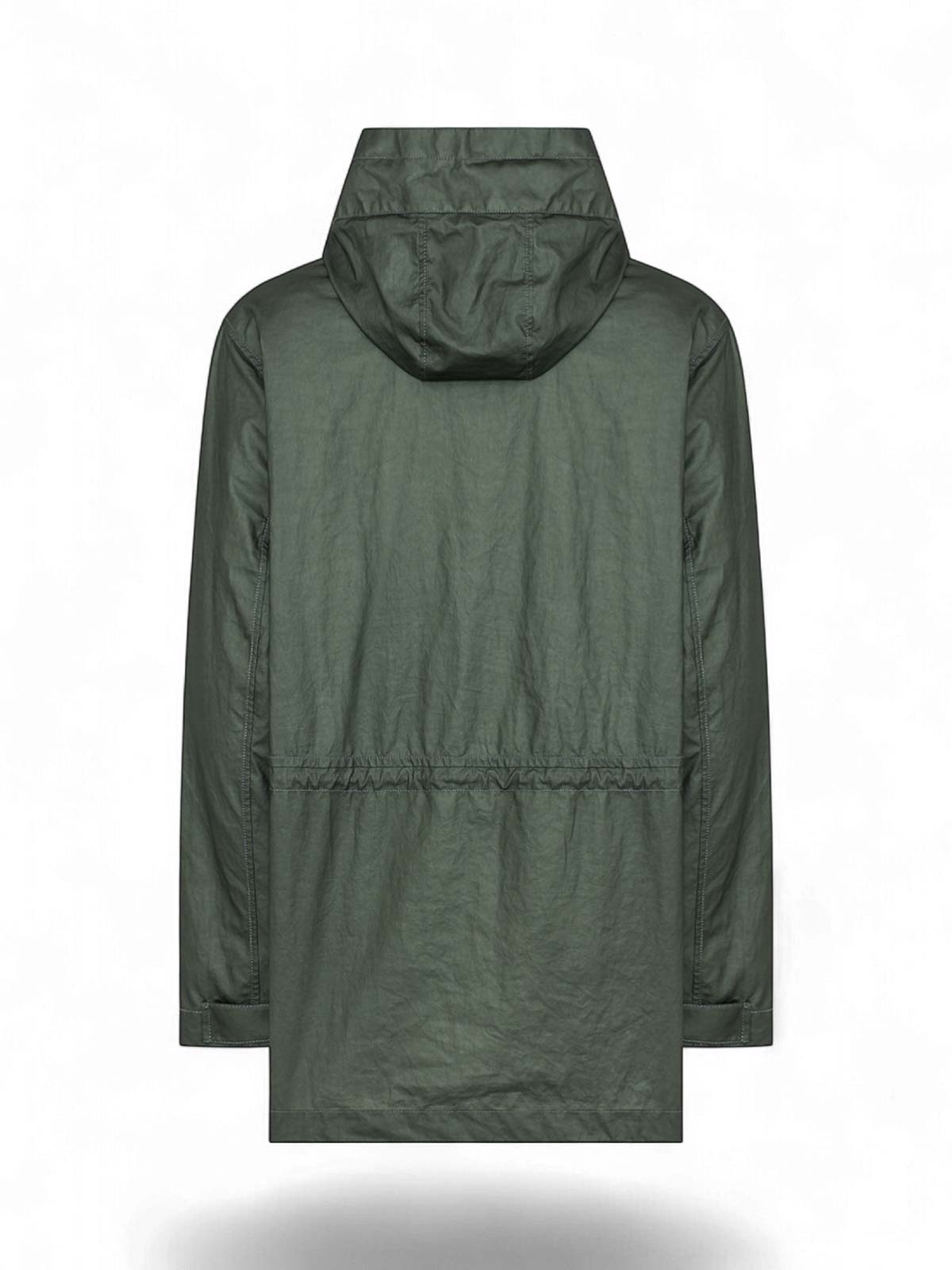 Duno, oceano-ravello, technical ramie coat, green, contemporary and functional coat made of technical fabric composed of ramie and polyurethane, which combines the natural texture of the plant fiber with modern performance and resistance. the oceano-ravello model stands out for its structured construction and clean silhouette, designed for versatile urban use in mid-seasons. the front closure with hidden zip and press studs guarantees greater protection while maintaining an essential and refined aesthetic. the integrated hood adds practicality, while the front patch pockets and the flap pocket on the chest introduce a sophisticated utility appeal. the regular fit ensures balanced comfort and a contemporary profile., technical fabric with a natural feel, front closure with hidden zip and snap buttons, integrated hood, front patch pockets, flap pocket on the chest, regular fit.