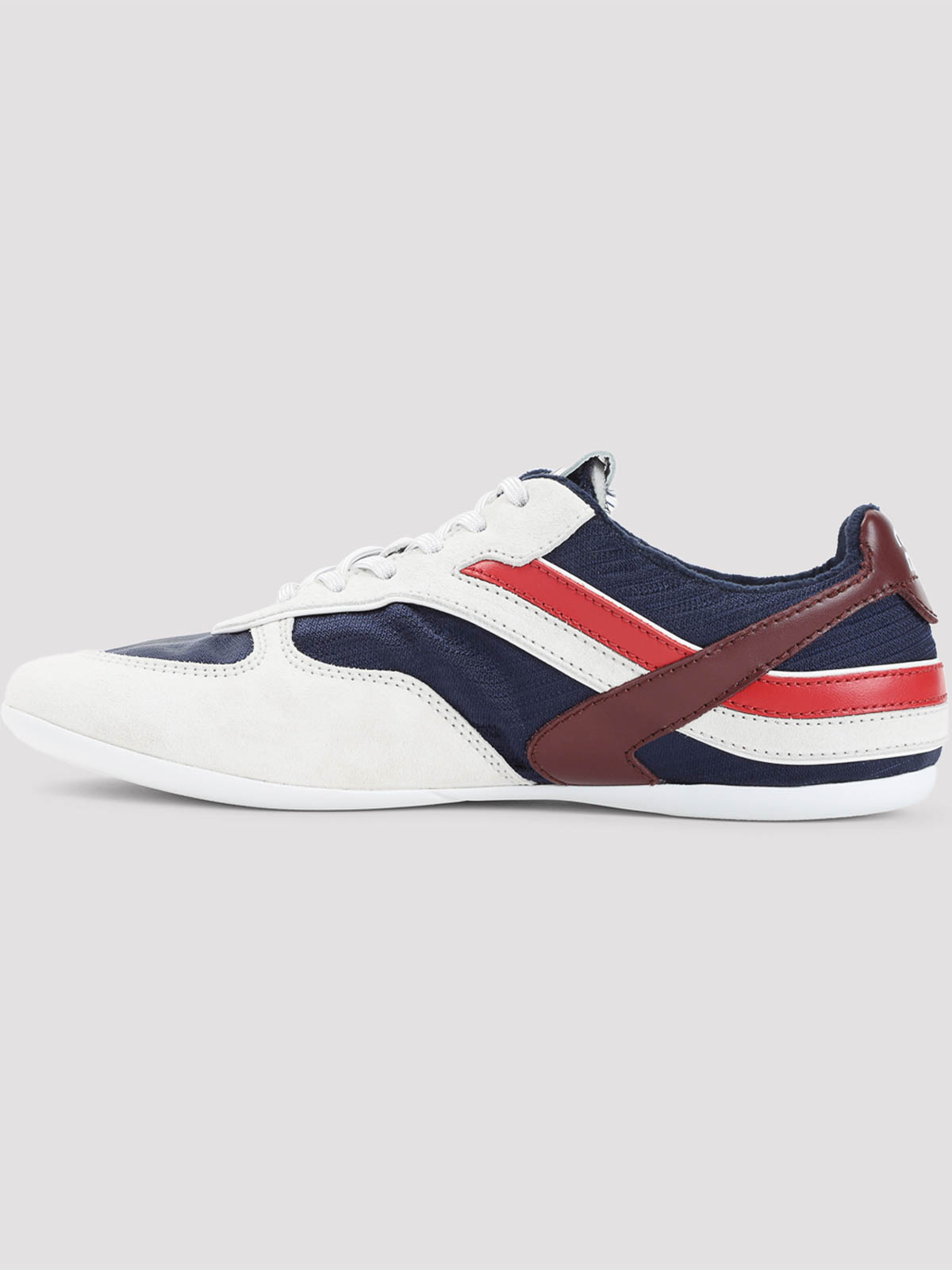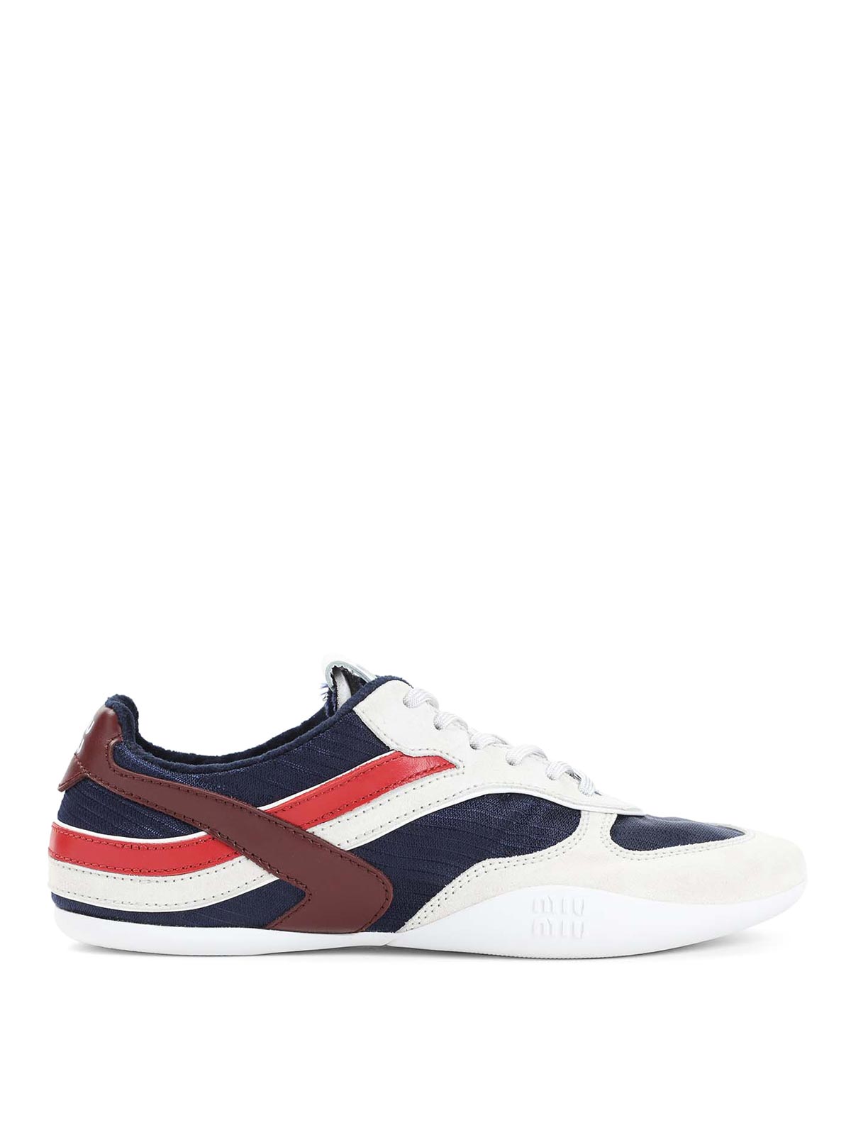 Miu miu gymnasium blue calf leather sneakers. vamp crafted from blue tech fabric, white and red inserts, round neckline, lace-up fastening, branded label on the tongue, stamped logo on the back, leather lining, textile insole, rubber outsole with embossed logo.