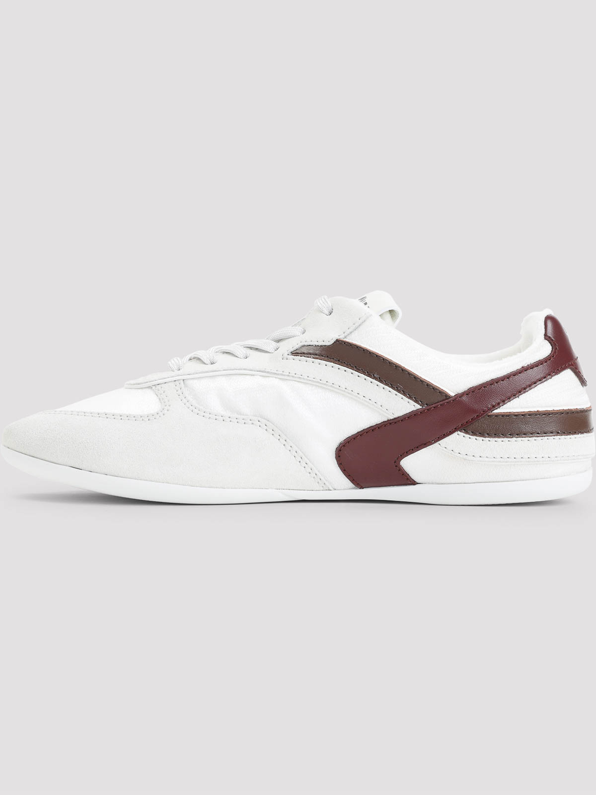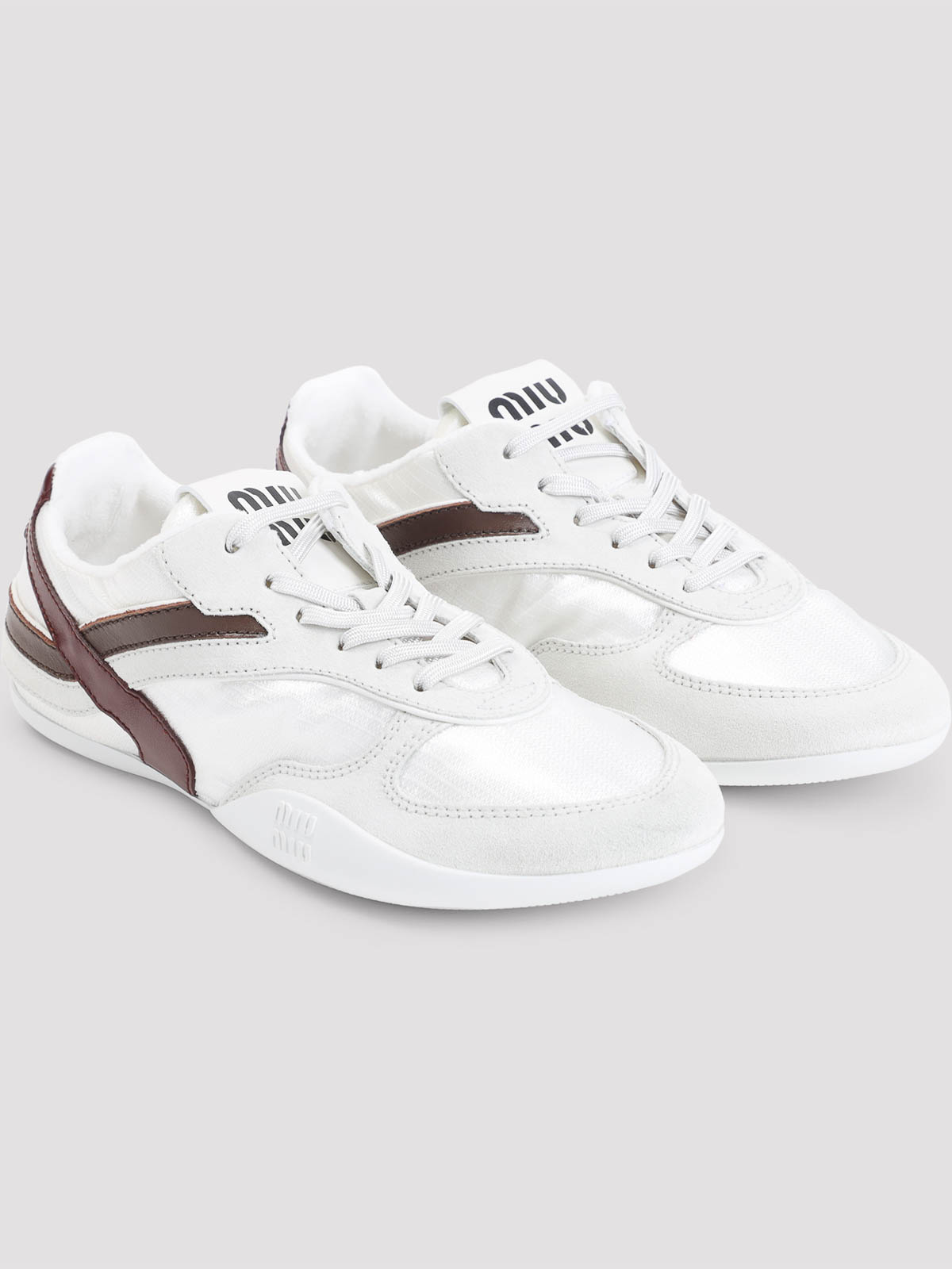 Miu miu gymnasium white calf leather sneakers. vamp crafted from white tech fabric, red inserts, round neckline, lace-up fastening, branded label on the tongue, stamped logo on the back, leather lining, textile insole, rubber outsole with embossed logo.