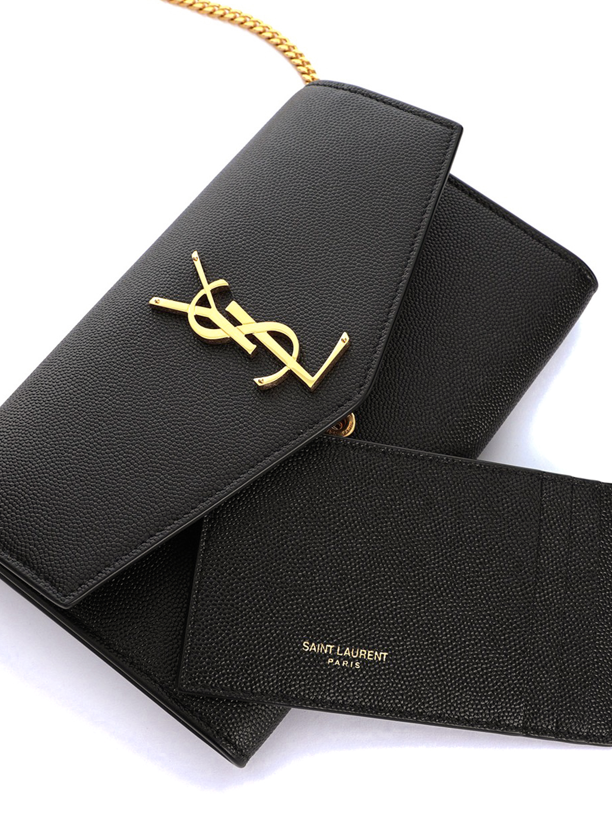 Leather wallet crossbody detailed with gold-tone metal logo, removable chain shoulder strap, snap closure and inner card holder.