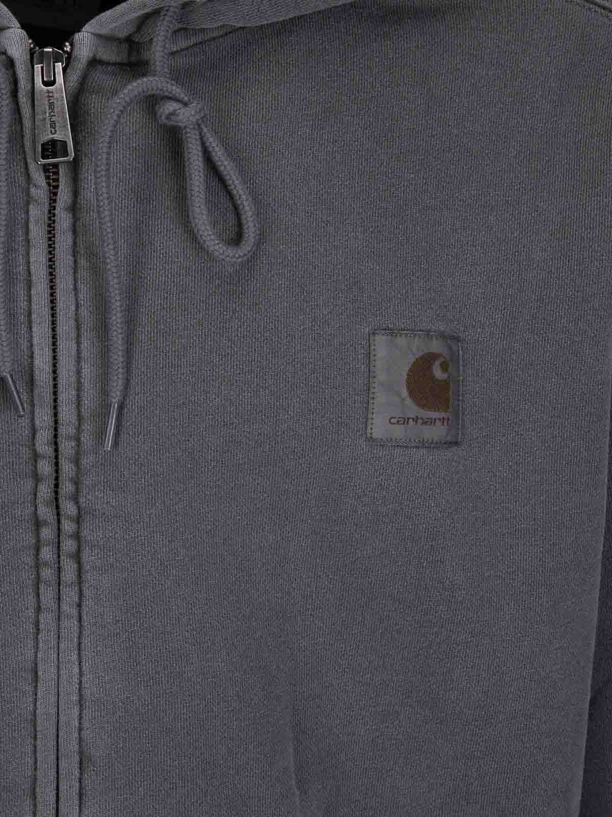 Hooded sweatshirt with drawstring, long sleeves, kangaroo pocket, two-way zip closure, logo label on the chest.