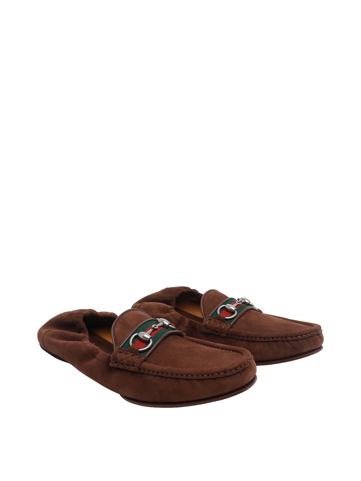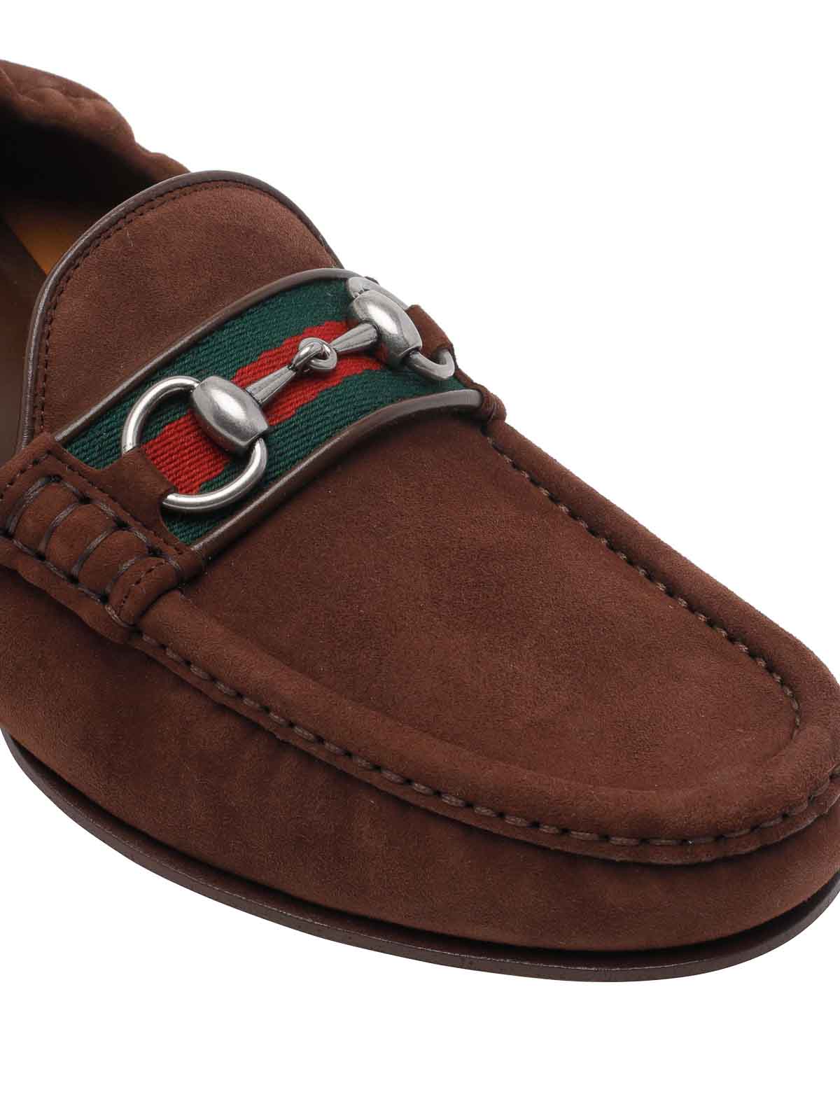 Gucci brown horsebit loafers, suede upper, round toe, web logo, slip on